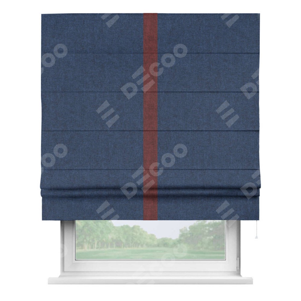 Римская штора пошита из ткани лён кашемир тёмно-синий, артикул: 17215, с отделкой кантом «Хайвэй» представляет собой уникальное и смелое дизайнерское решение, где кант расположен вертикально посередине шторы. Этот дизайн не только выделяет штору среди других вариантов оформления окон, но и создает интересный визуальный акцент, привлекая внимание к центру окна и разделяя штору на визуальные зоны. Такой нестандартный подход добавляет динамичности интерьеру и может быть использован для подчеркивания особенностей оформления помещения.
