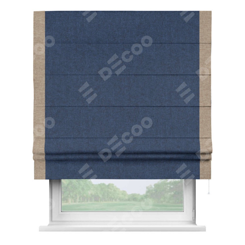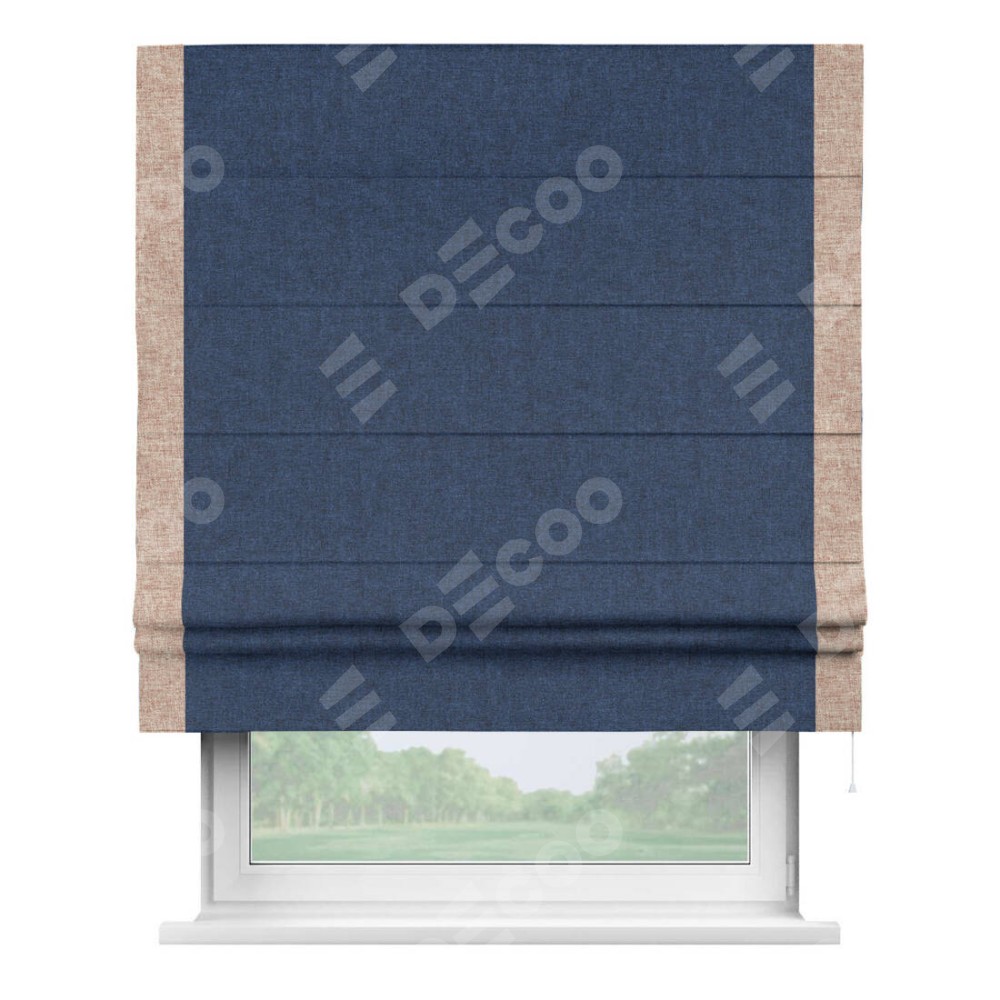 Римская штора пошита из ткани лён кашемир тёмно-синий, артикул: 17215, с отделкой кантом «Стрим Дуо» выделяется наличием кантов по обоим бокам шторы, слева и справа. Этот дизайн придает шторе аккуратный и завершенный вид, акцентируя вертикальные линии и визуально вытягивая окно в высоту. Отделка кантом по бокам не только украшает штору, но и служит практической функцией, укрепляя края и продлевая срок службы изделия.