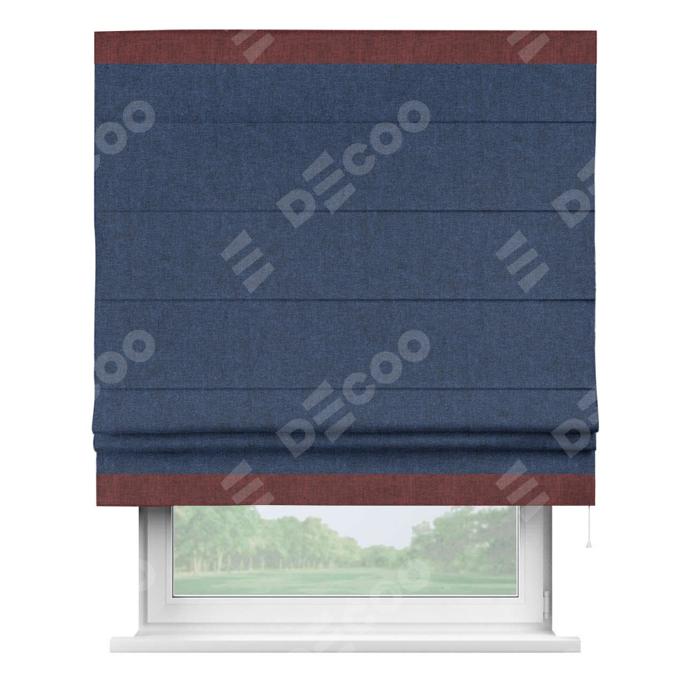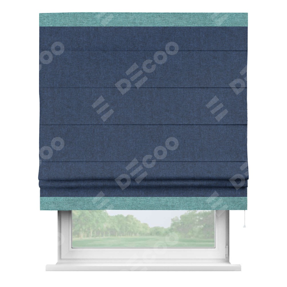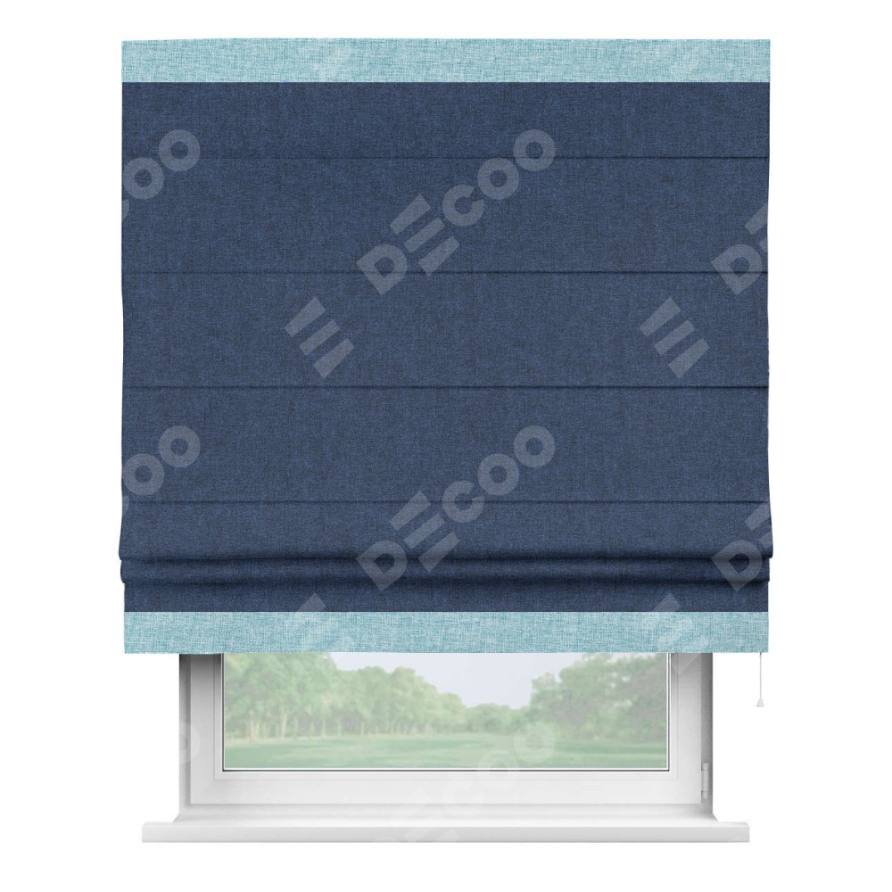 Римская штора пошита из ткани лён кашемир тёмно-синий, артикул: 17215, с отделкой кантом «Горизонт» предлагает уникальное дизайнерское решение, при котором кант располагается только вверху и снизу шторы. Такое решение делает акцент на горизонтальных линиях, визуально расширяя пространство и придавая окну более строгий и организованный вид. Отделка кантом в этих ключевых местах не только украшает штору, но и способствует её долговечности, защищая наиболее уязвимые к износу края.