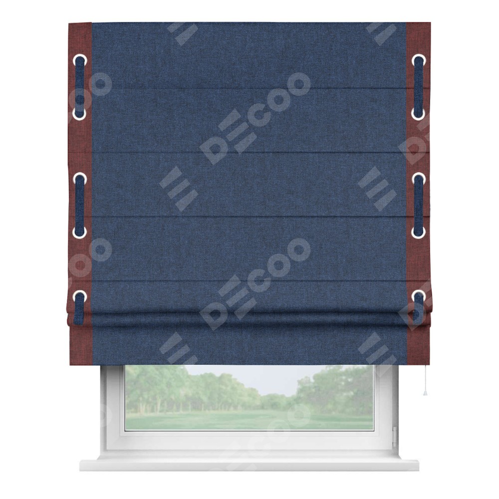Римская штора «Кортин» для проёма, лён кашемир тёмно-синий, с кантом Стрим Дуо (люверсы с пояском)