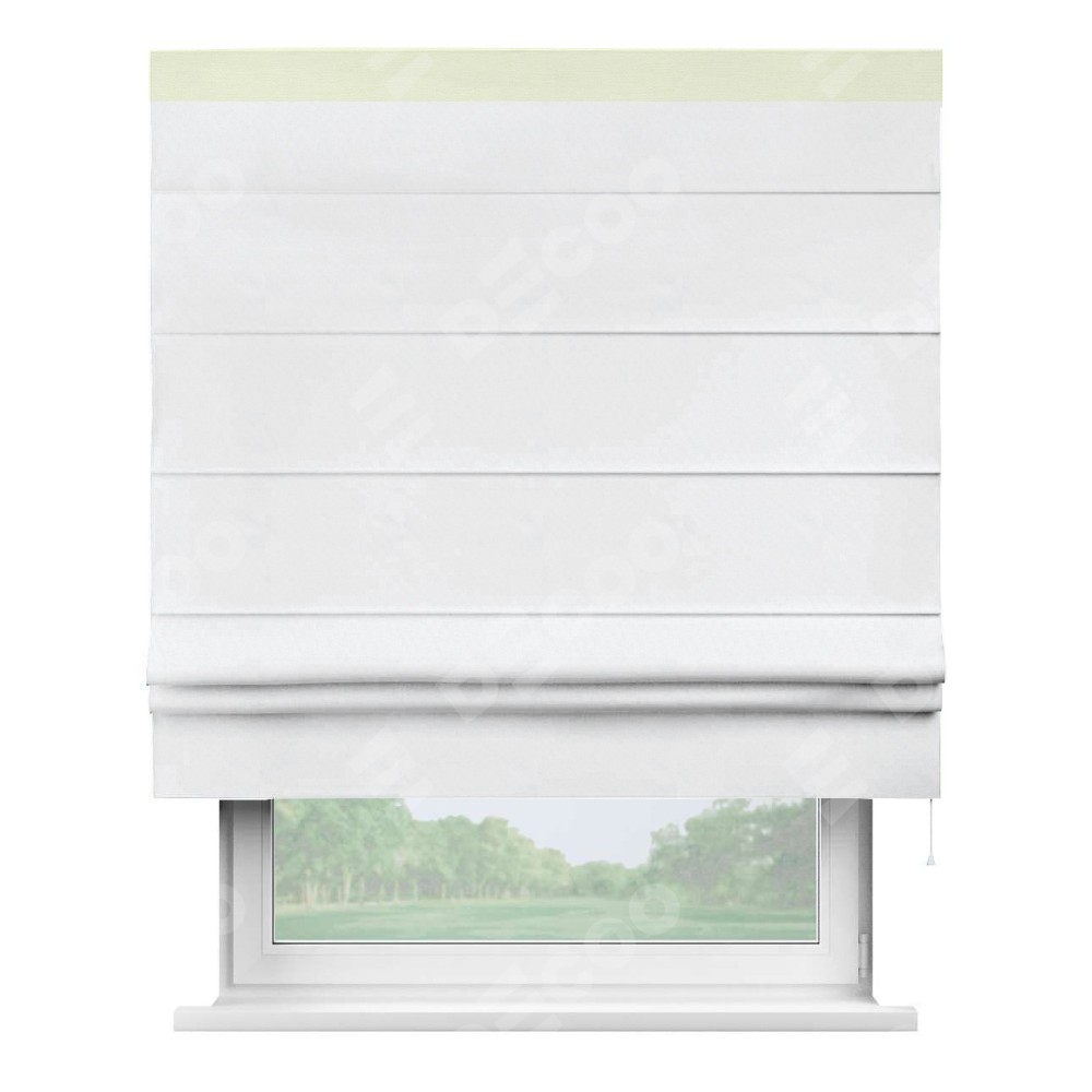 Римская штора пошита из ткани вельвет белоснежный, артикул: 92698, с отделкой кантом «Кинг» отличается своей необычной особенностью: кант располагается исключительно сверху шторы. Такой дизайн делает акцент на верхней части окна, визуально поднимая потолок и придавая интерьеру более возвышенный и изысканный вид. Отделка кантом на верхней кромке не только украшает штору, но и может служить дополнительной защитой от износа в месте наибольшего контакта с механизмом управления шторой.