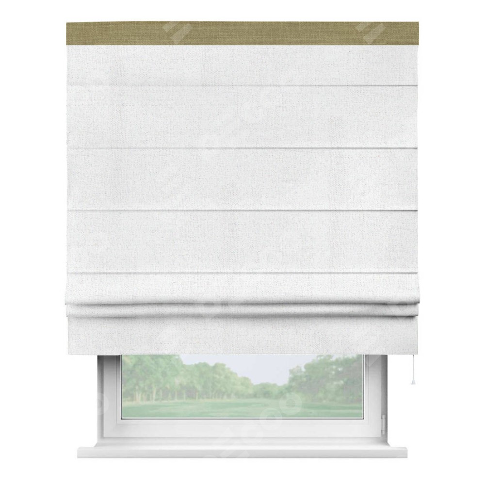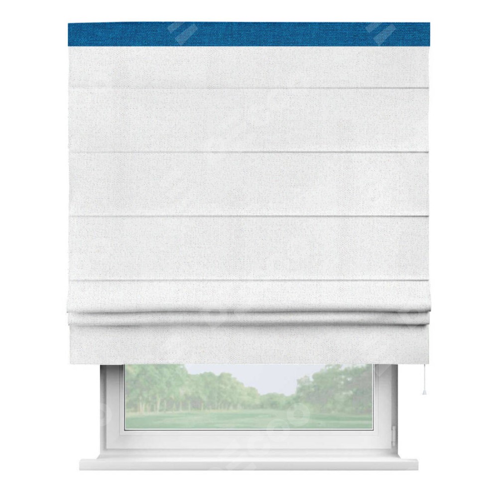 Римская штора пошита из ткани лён белоснежный, артикул: 95632, с отделкой кантом «Кинг» отличается своей необычной особенностью: кант располагается исключительно сверху шторы. Такой дизайн делает акцент на верхней части окна, визуально поднимая потолок и придавая интерьеру более возвышенный и изысканный вид. Отделка кантом на верхней кромке не только украшает штору, но и может служить дополнительной защитой от износа в месте наибольшего контакта с механизмом управления шторой.
