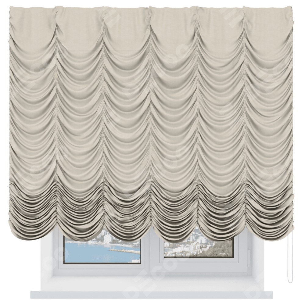 Французская штора производителя «Cortin», используется для проёма, пошита из ткани лён кашемир шампань, артикул ткани 17205. Имеет универсальный механизм и подходит для монтажа: на потолок и на стену.