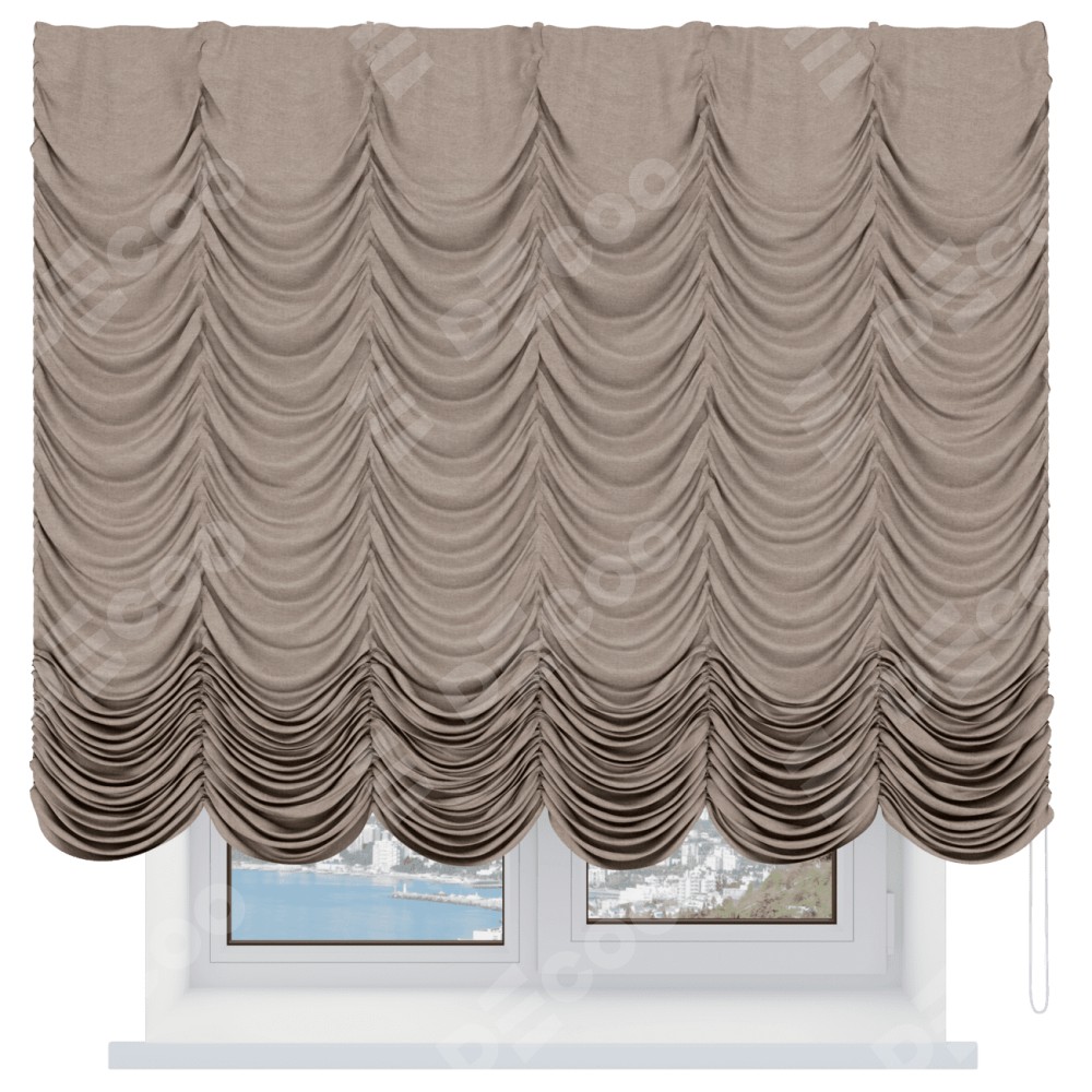 Французская штора производителя «Cortin», используется для проёма, пошита из ткани лён кашемир коричневый, артикул ткани 21614. Имеет универсальный механизм и подходит для монтажа: на потолок и на стену.