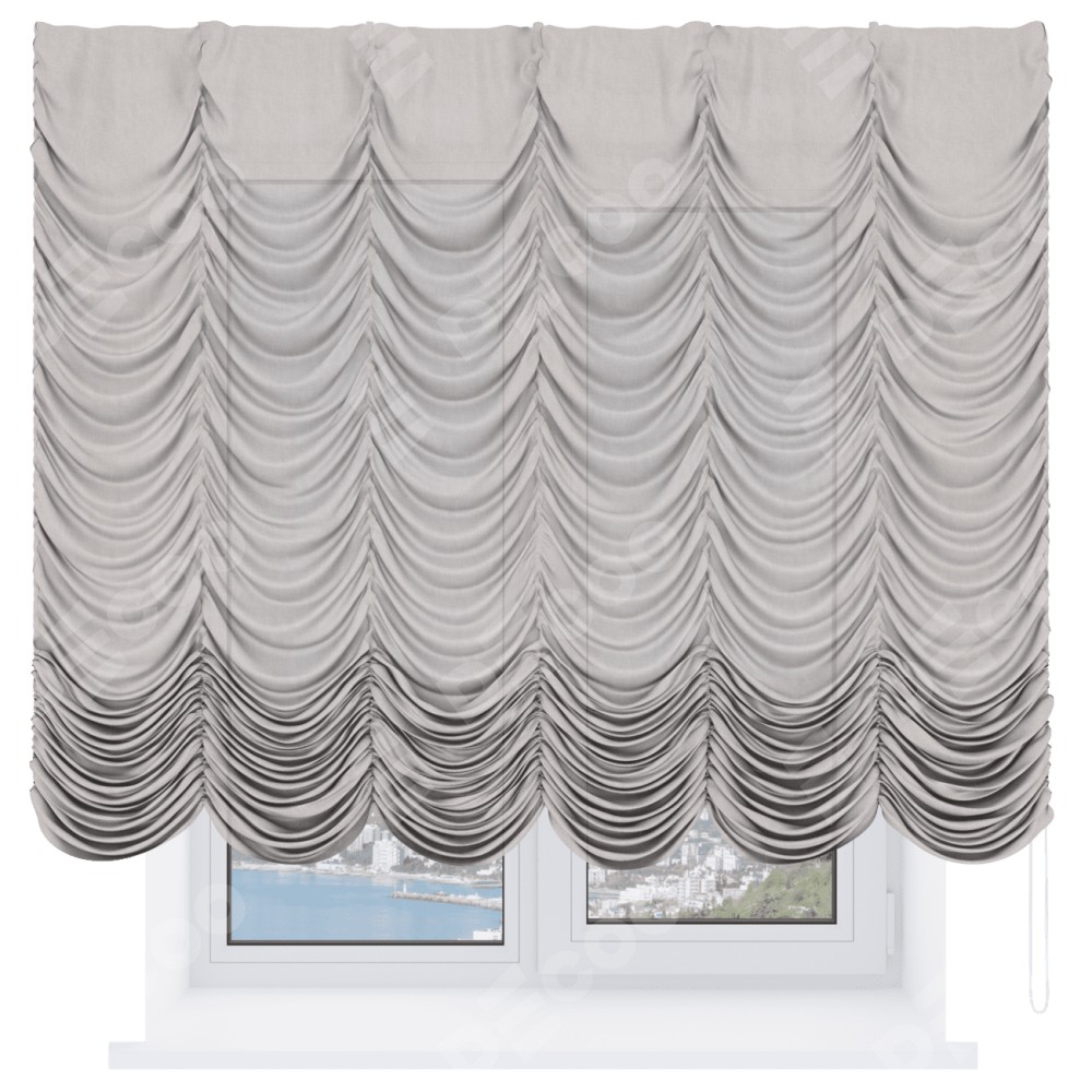 Французская штора производителя «Cortin», используется для проёма, пошита из ткани лён кашемир натуральный беж. Имеет универсальный механизм и подходит для монтажа: на потолок и на стену.