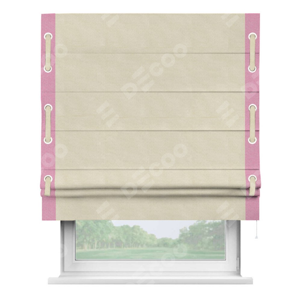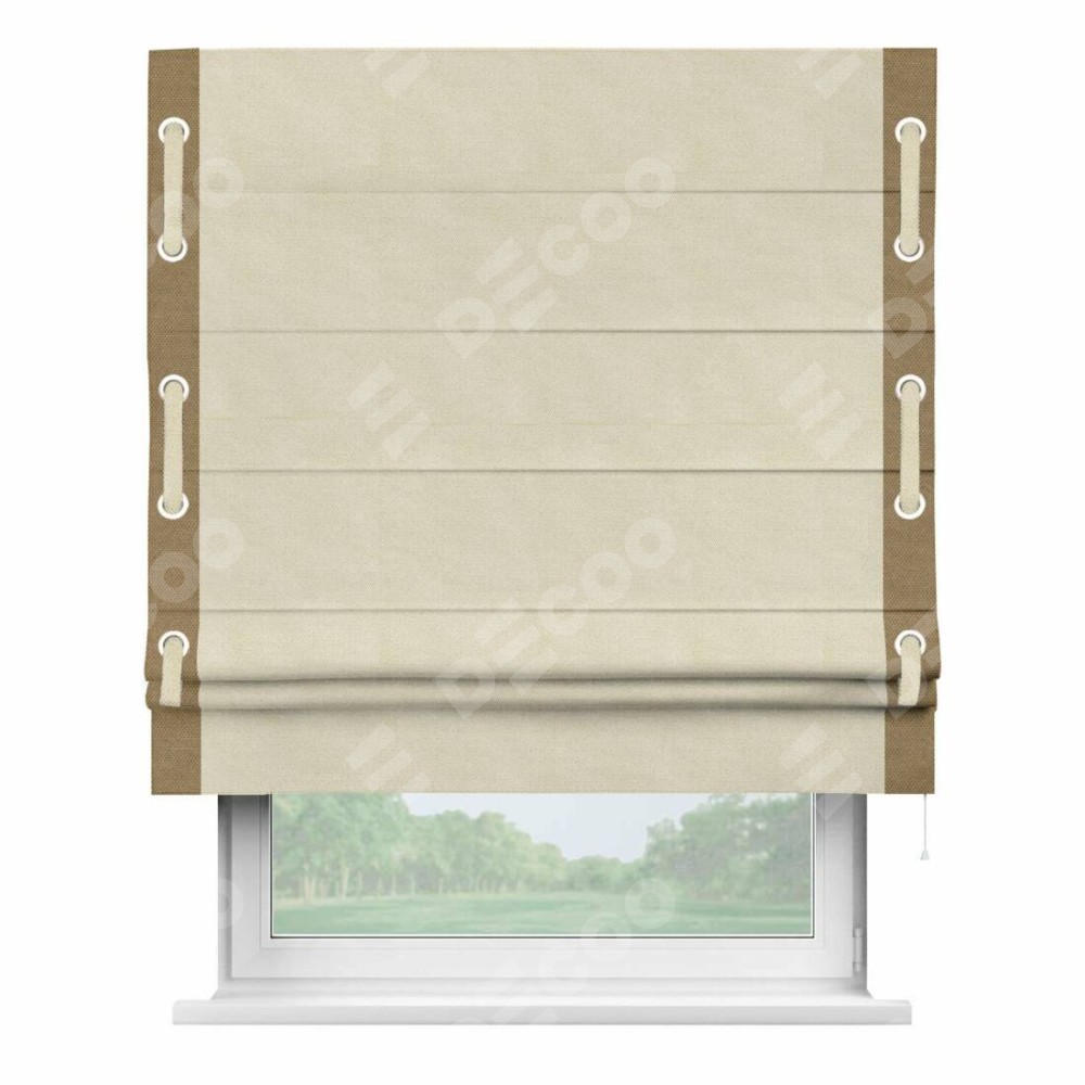 Римская штора производителя «Cortin», используется для проёма, пошита из ткани лён димаут бежевый, артикул 83023. Отделка шторы кантом «Стрим Дуо» на кантах расположены люверсы с пояском, ткань для канта используется лён димаут разной расцветки на выбор. Ткань для пояска обычно используется из основной ткани шторы, а так же можно сделать из любой расцветки по желанию. Имеет универсальный механизм и подходит для монтажа: на потолок, на стену и в нишу.