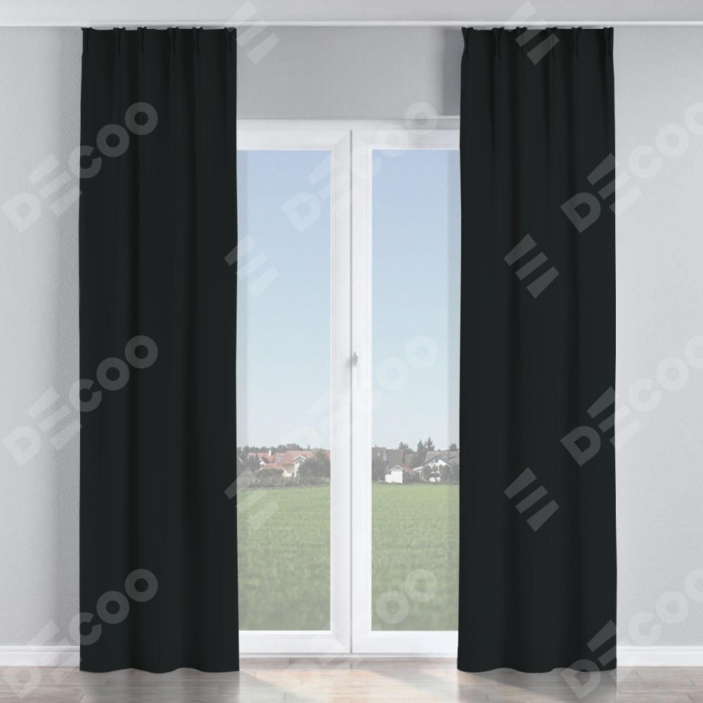 Комплект прямых штор, от производителя «Cortin», пошиты из ткани блэкаут однотонный черный, артикул ткани 37. С изнаночной стороны в верхней части штор пристрачивается шторная лента с декоративными складками «Кустик». Для создания элегантных складок прямые шторы шьются по стандарту с коэффициентом 1:2 (на 100 см. ширины проёма 200 см. ширины ткани).