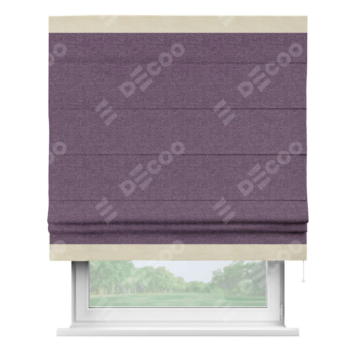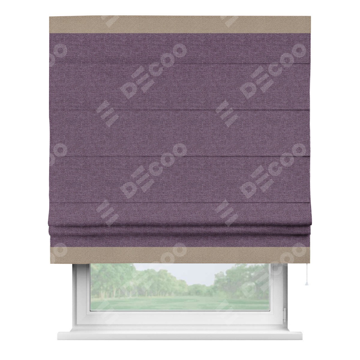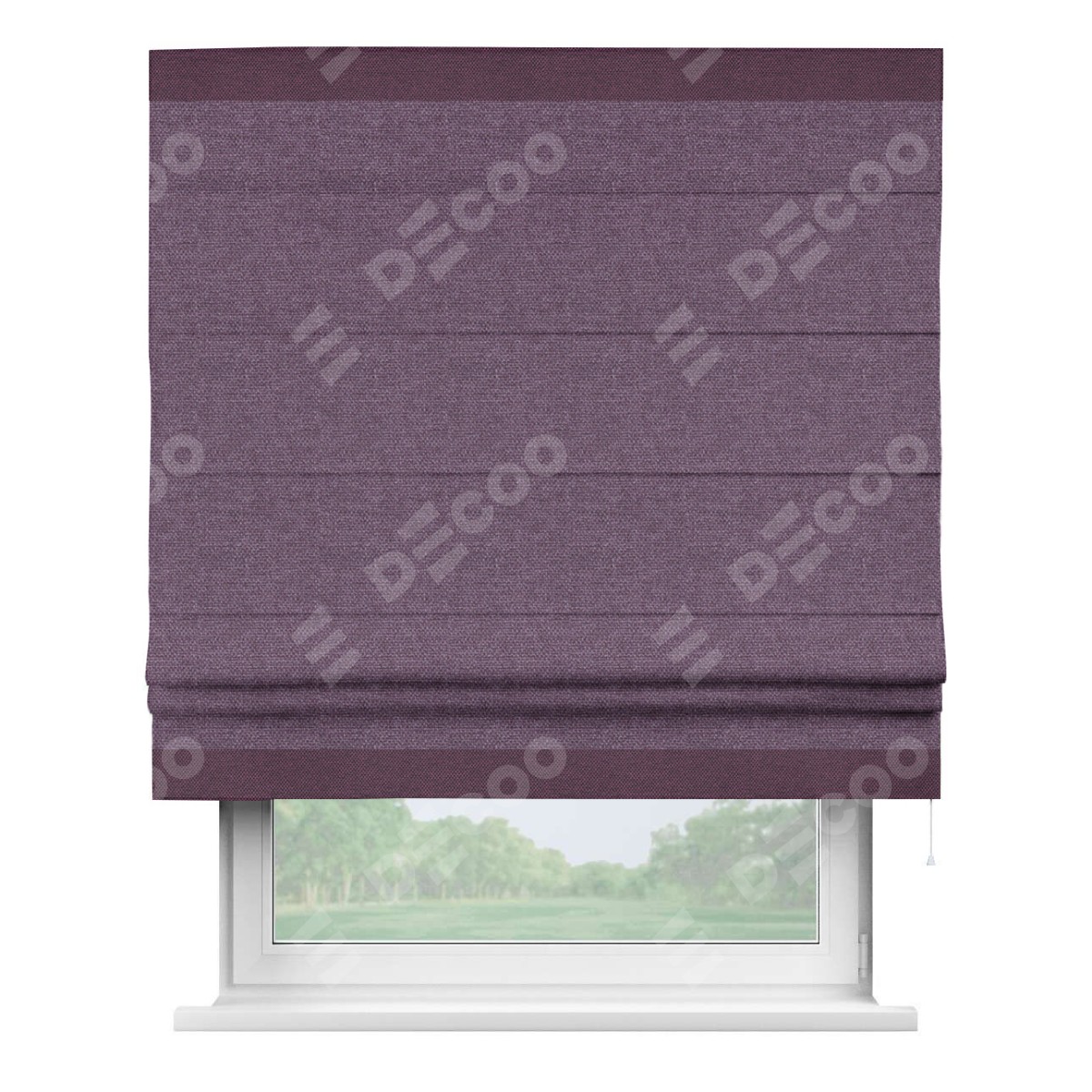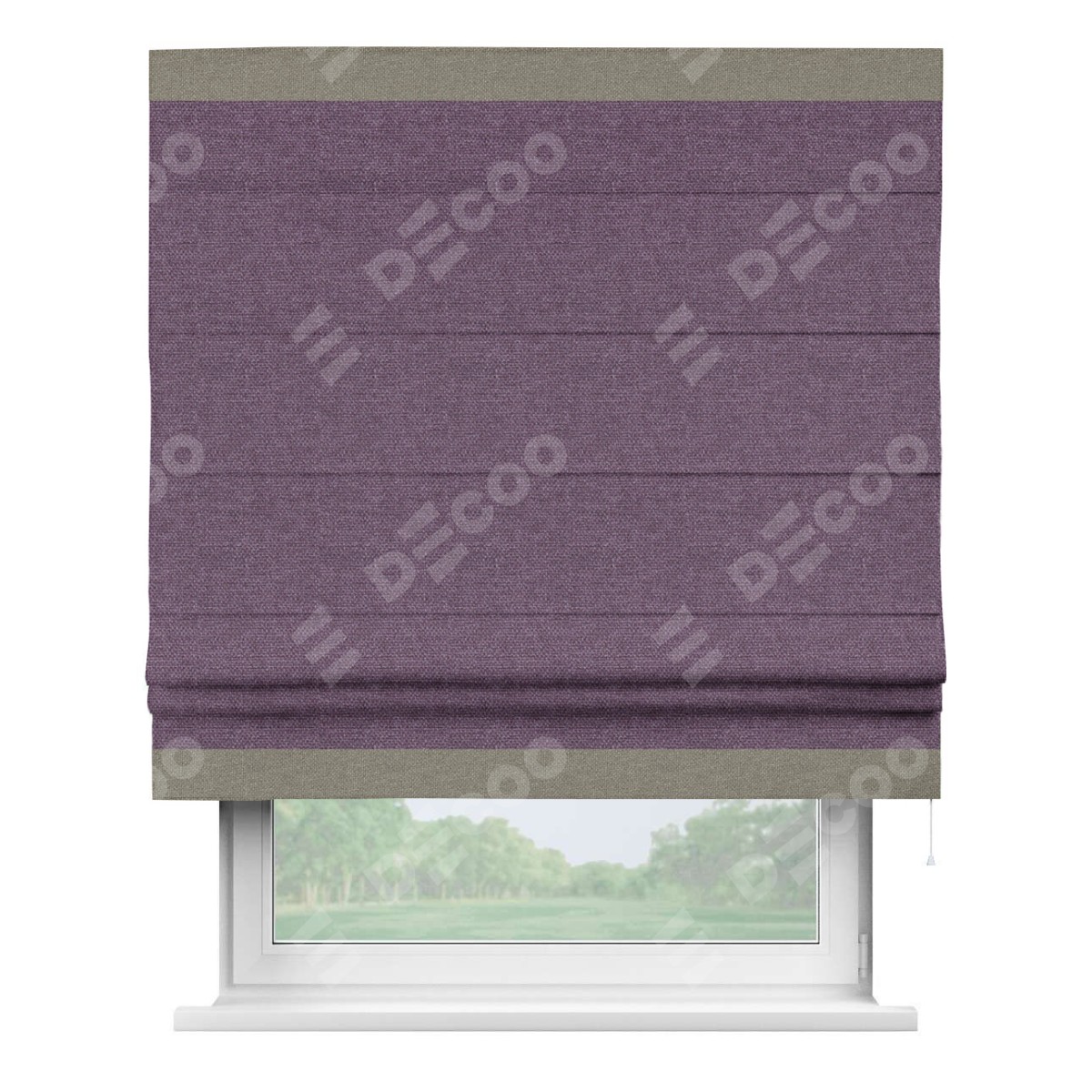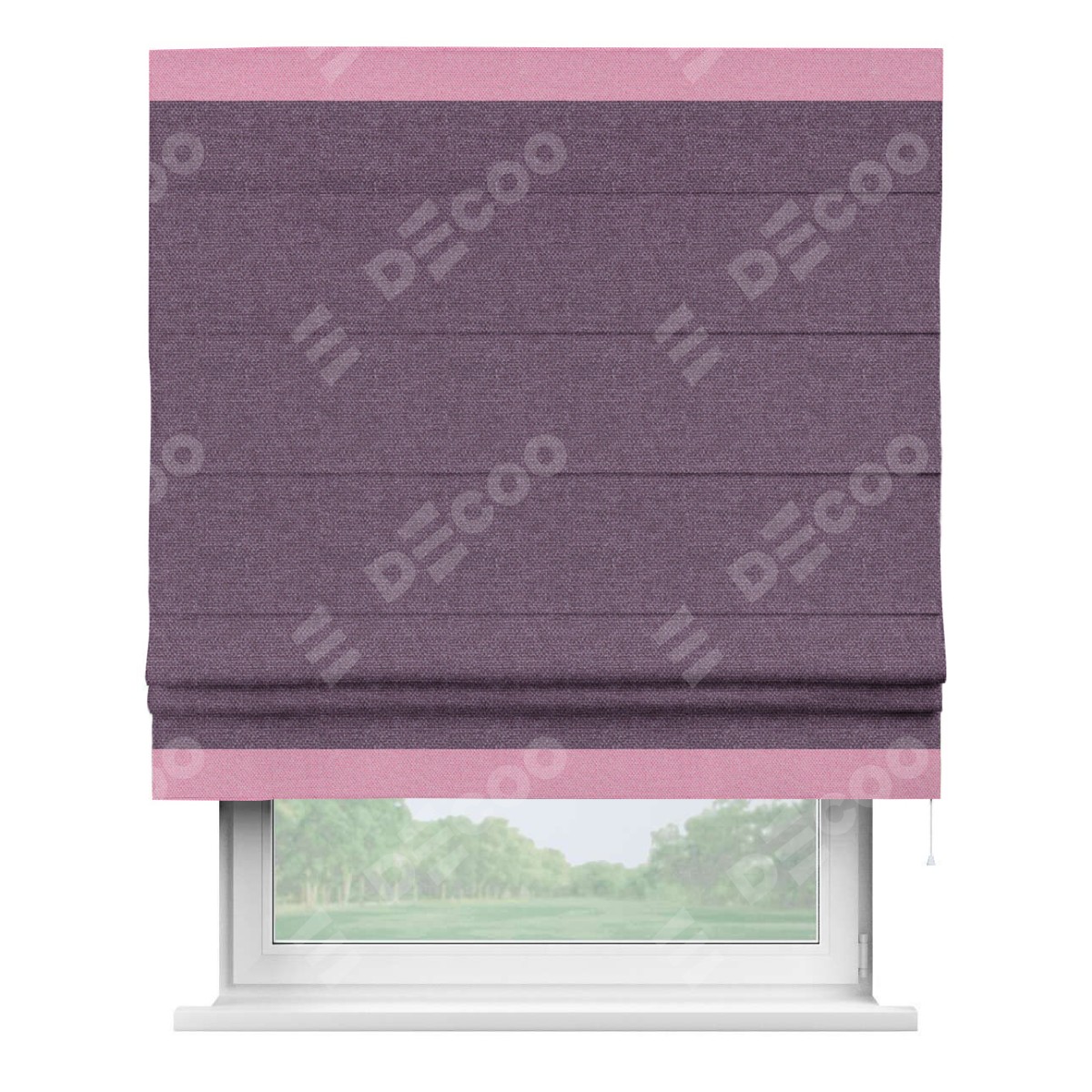 Римская штора производителя «Cortin», используется для проёма, пошита из ткани лён димаут брусника, артикул 16. Отделка шторы кантом «Горизонт», ткань для канта используется из льна димаут разной расцветки на выбор. Имеет универсальный механизм и подходит для монтажа: на потолок, на стену и в нишу.