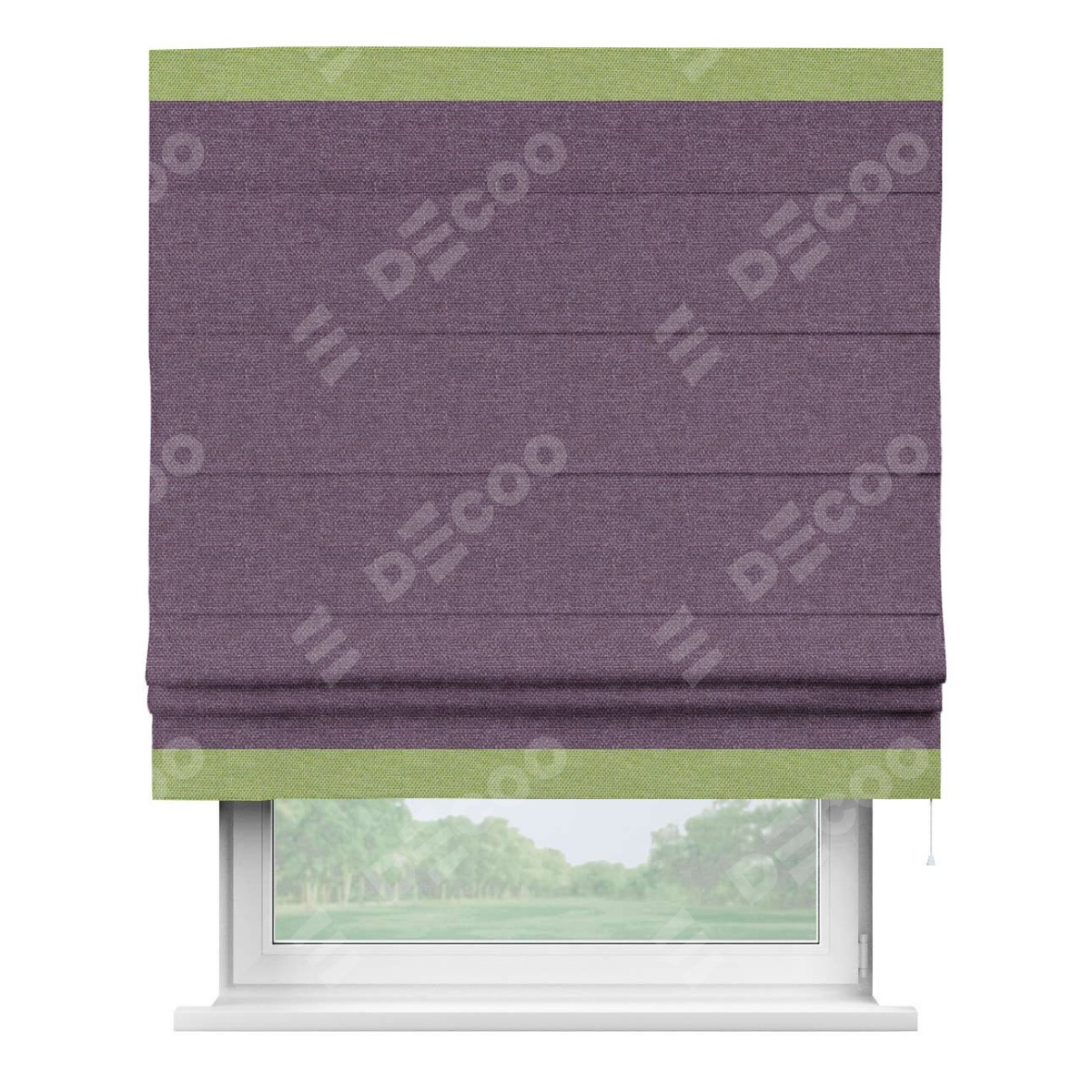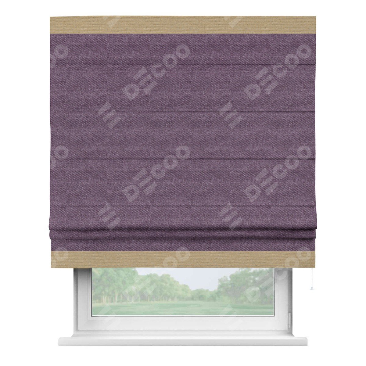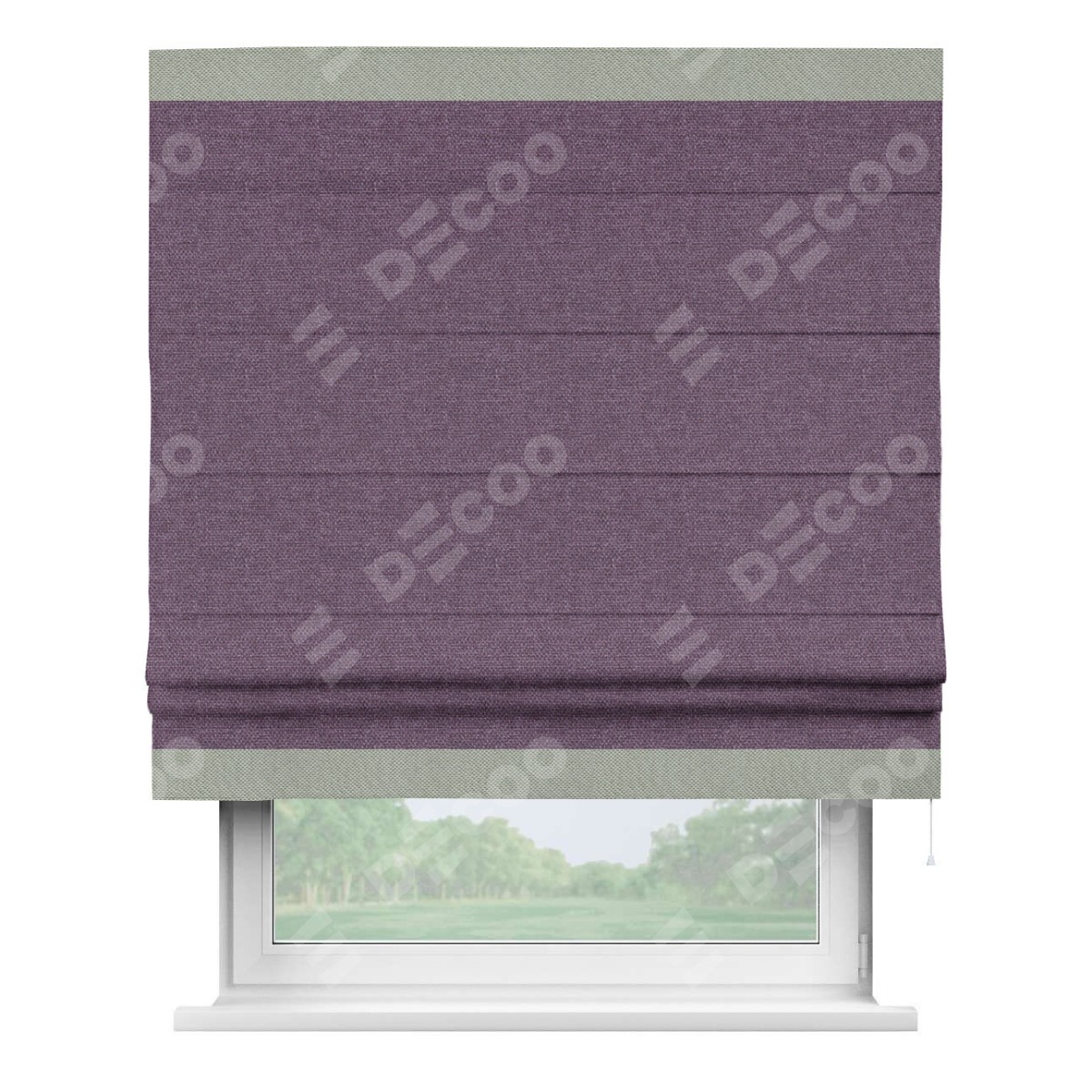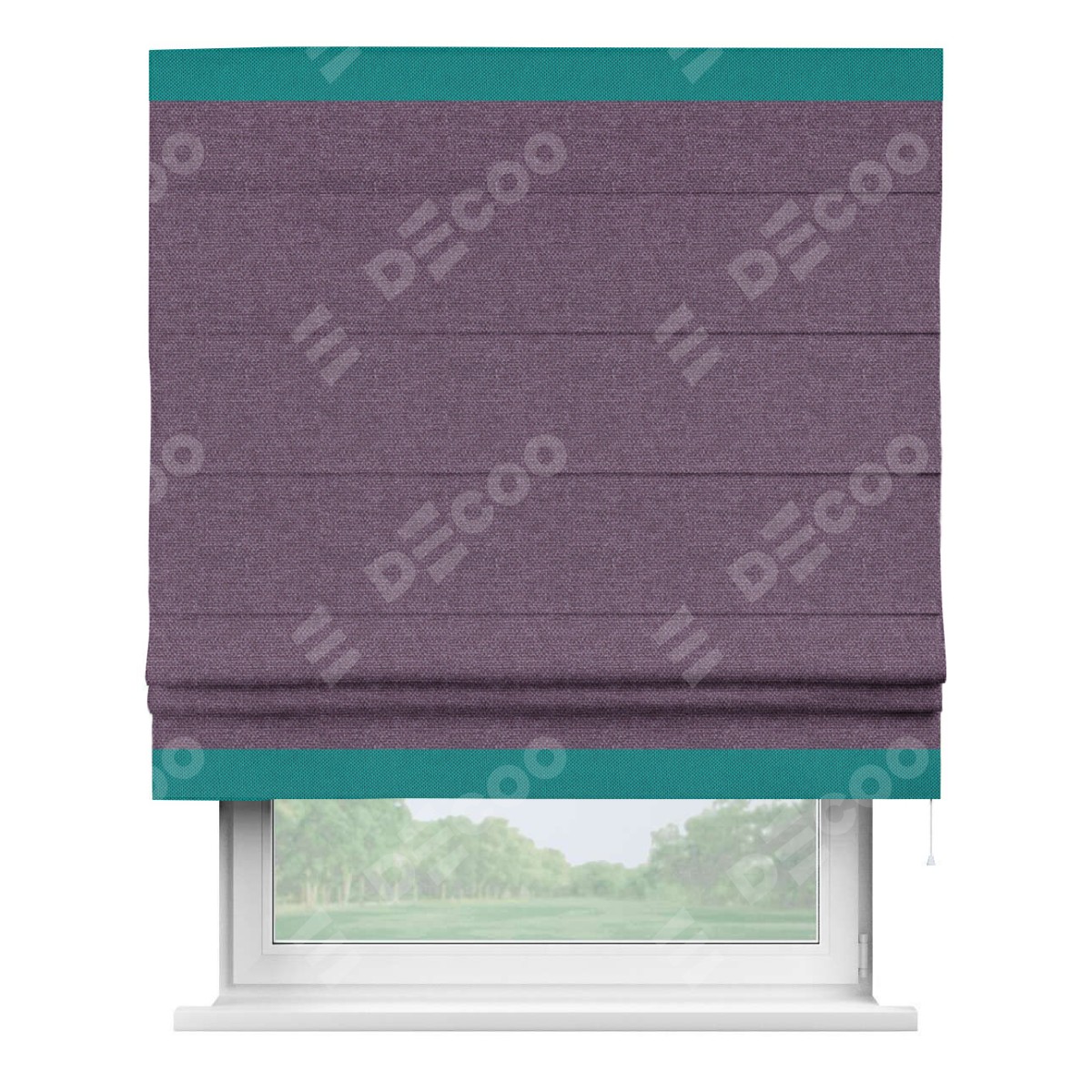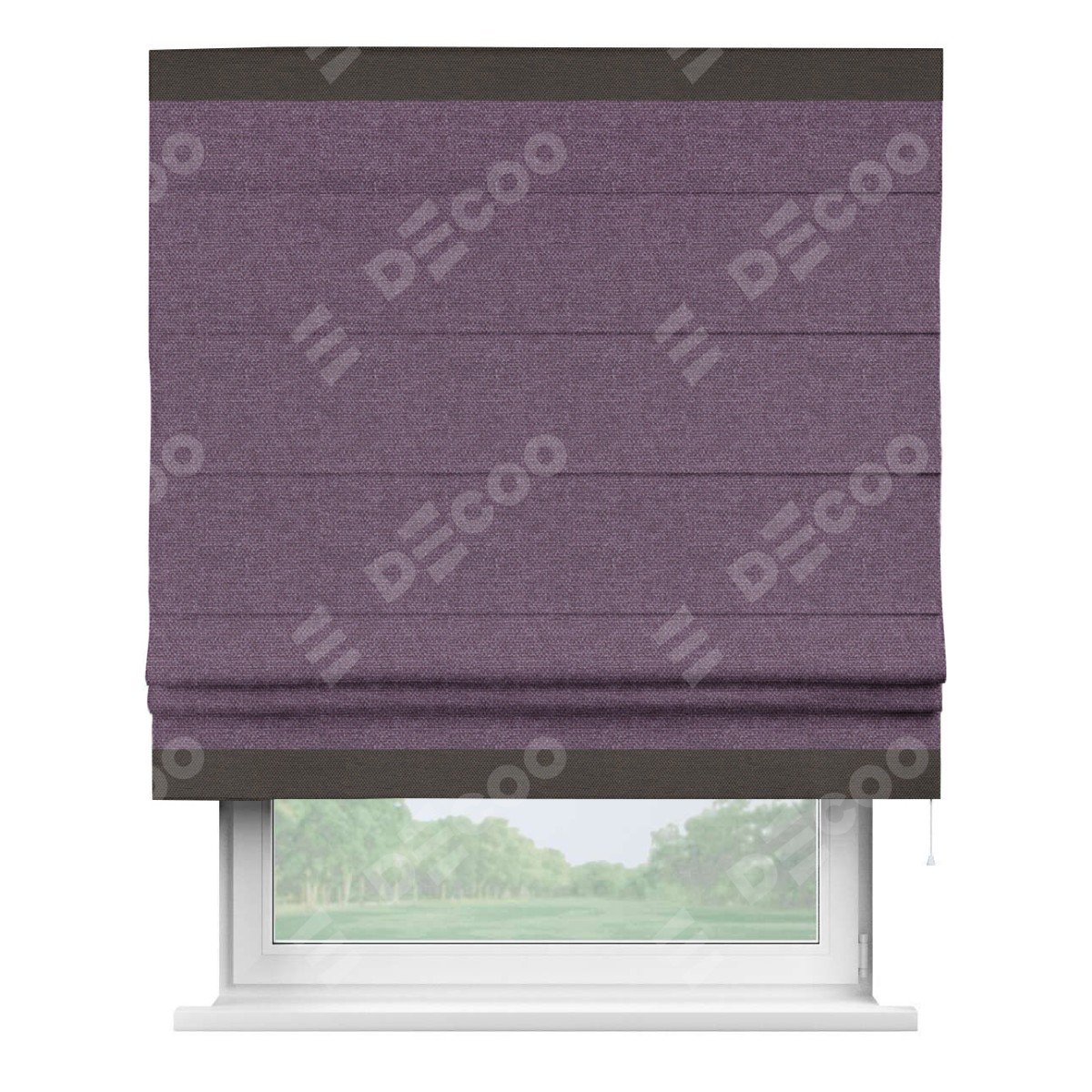 Римская штора производителя «Cortin», используется для проёма, пошита из ткани лён димаут брусника, артикул 16. Отделка шторы кантом «Горизонт», ткань для канта используется из льна димаут разной расцветки на выбор. Имеет универсальный механизм и подходит для монтажа: на потолок, на стену и в нишу.