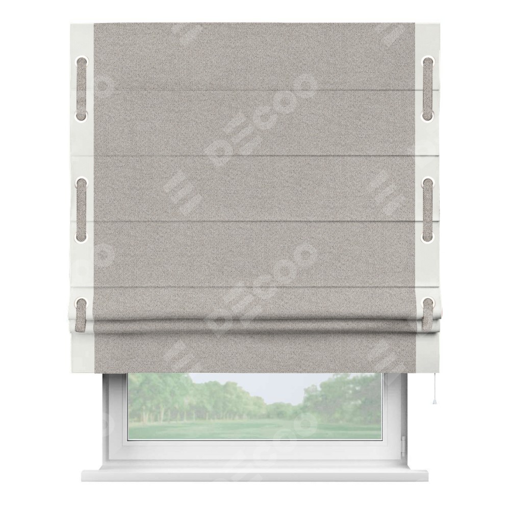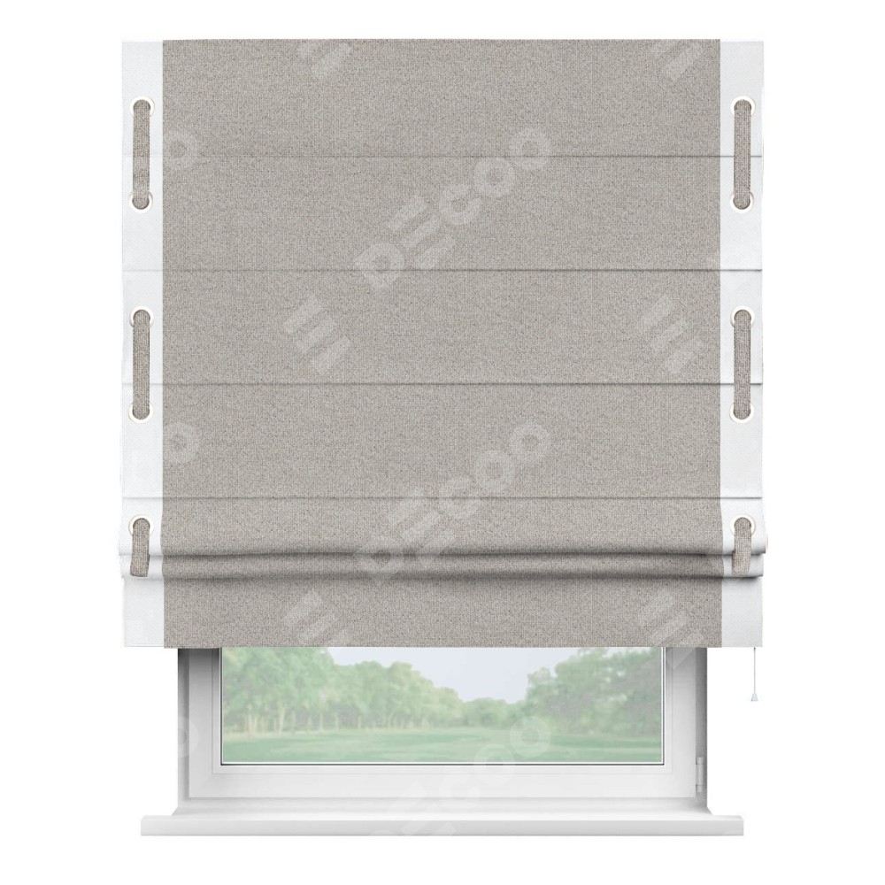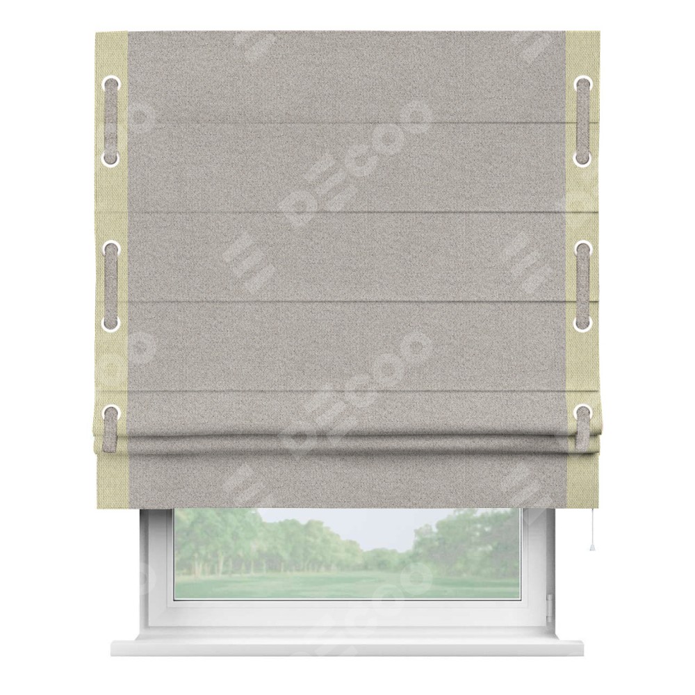 Римская штора «Кортин» для проема, лён димаут серо-бежевый с кантом Стрим Дуо (люверсы с пояском)