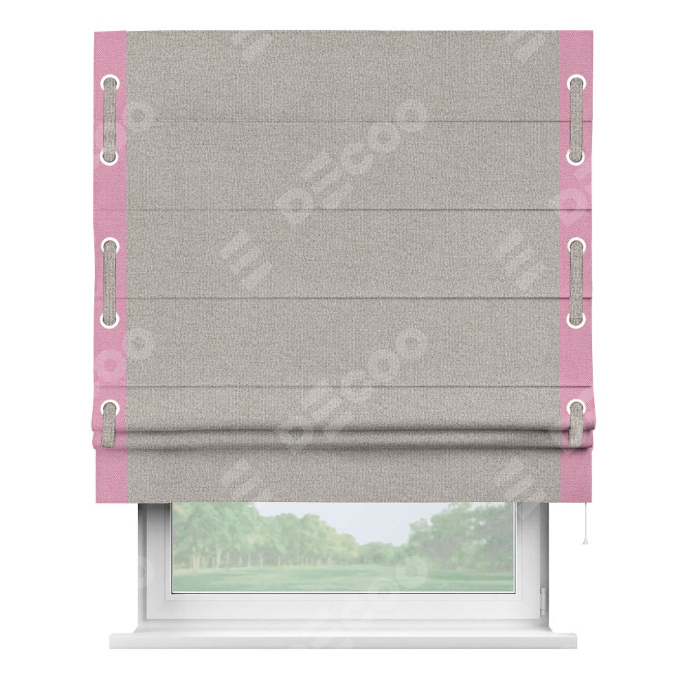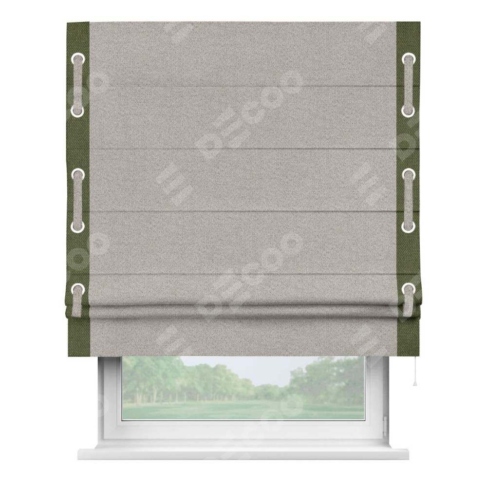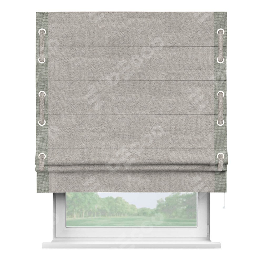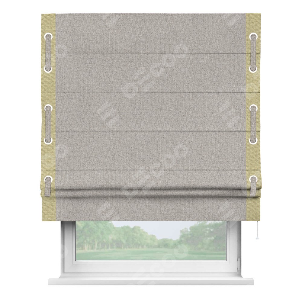 Римская штора «Кортин» для проема, лён димаут серо-бежевый с кантом Стрим Дуо (люверсы с пояском)