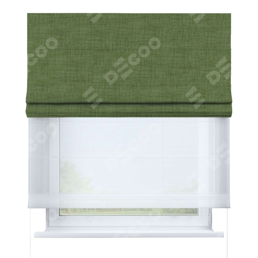 Двойная римская штора «День-ночь» от производителя Cortin предназначена для использования в проёмах. Эта штора уникальна тем, что состоит из двух полотен. На лицевой стороне находится лён зелёный (артикул: 131547), обеспечивающий эффективное затемнение. В комплект также входит вторая ткань — легкий белый тюль (артикул: V-01), который добавляет изящества и легкости оформлению окна. Кроме того, доступны и другие разновидности ткани тюль, выбор которых доступен по  ссылке .