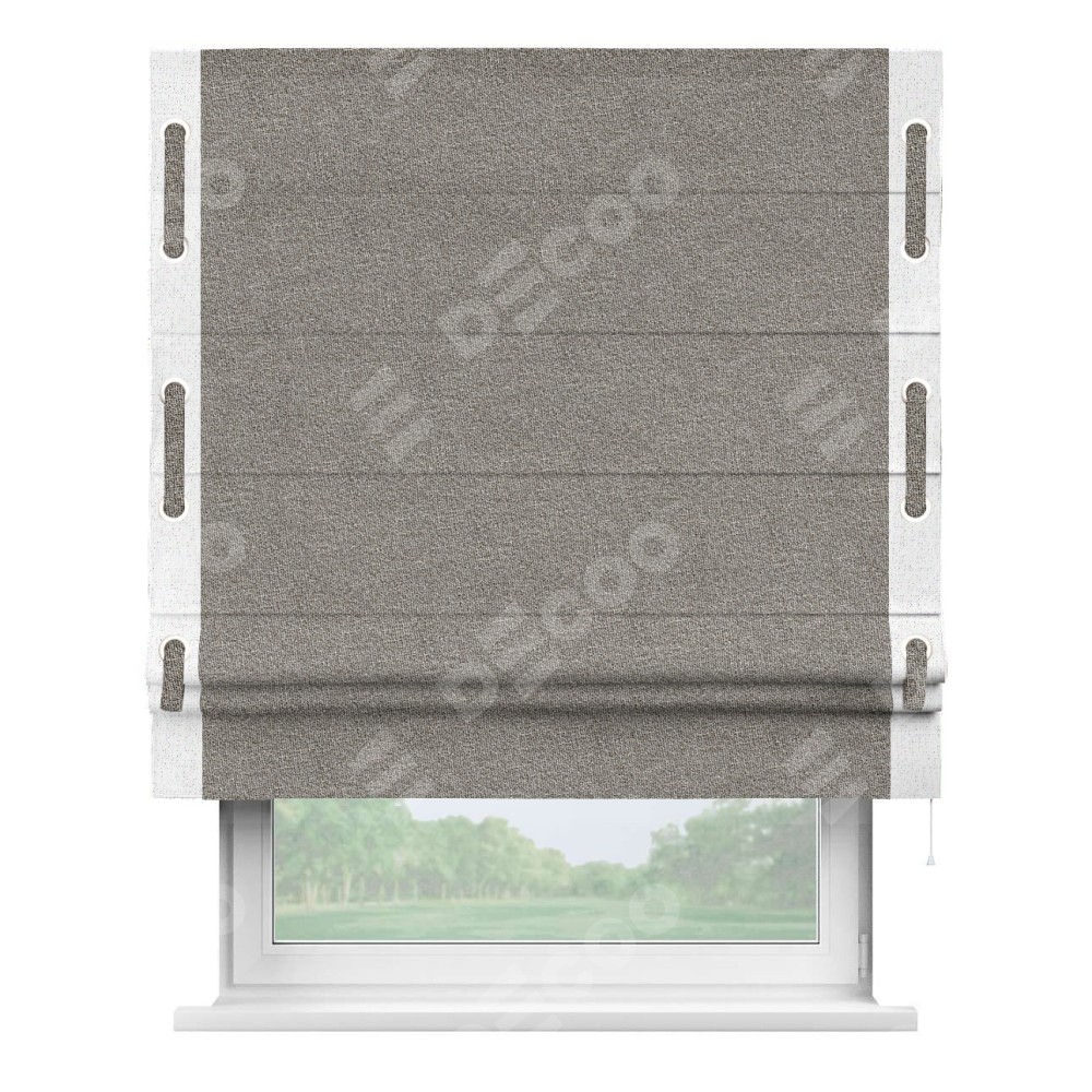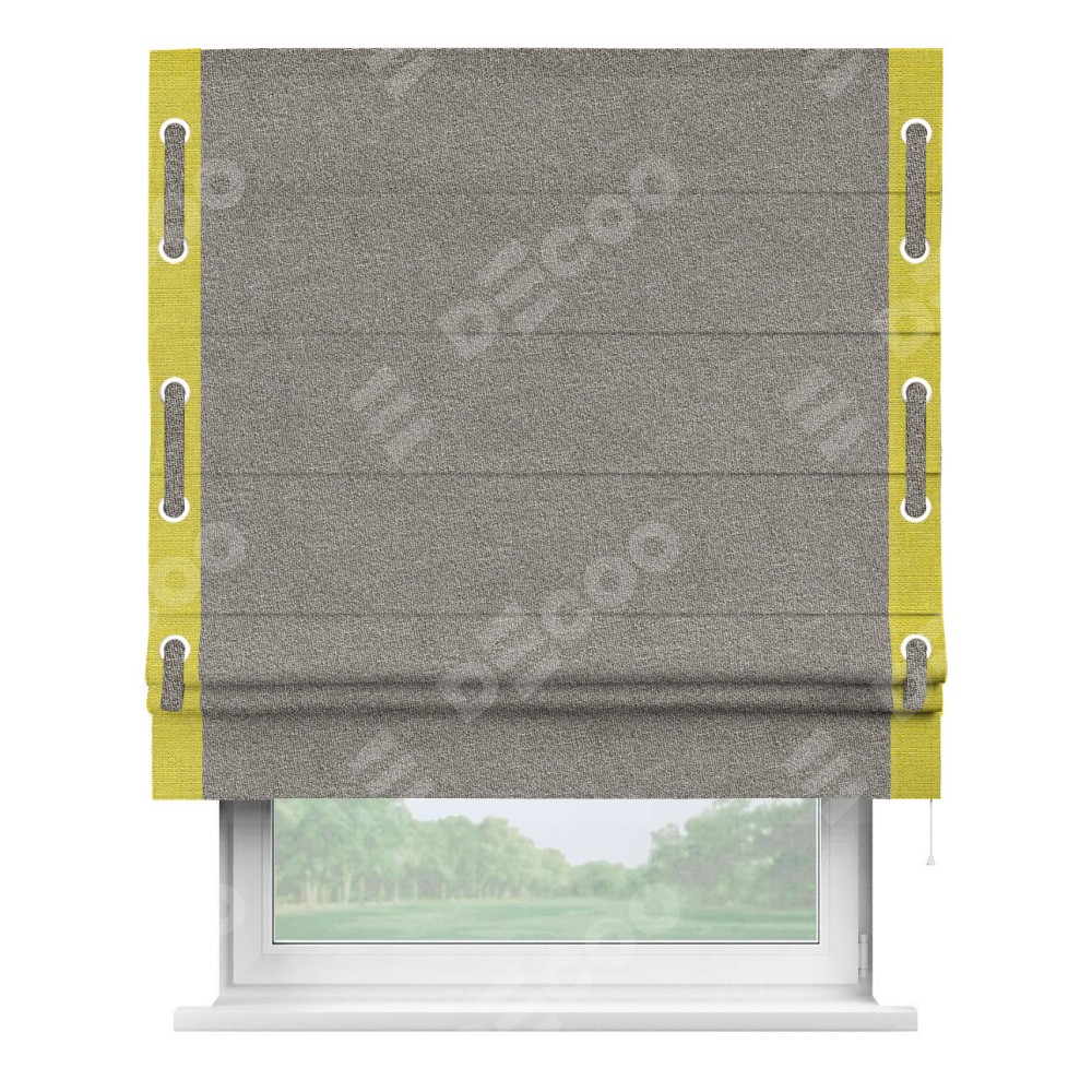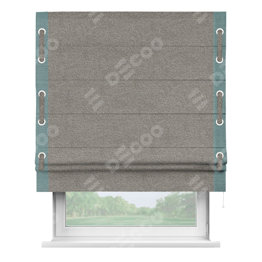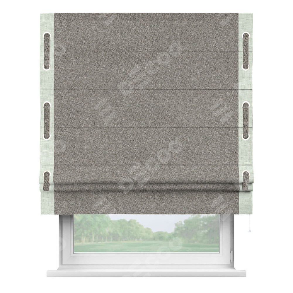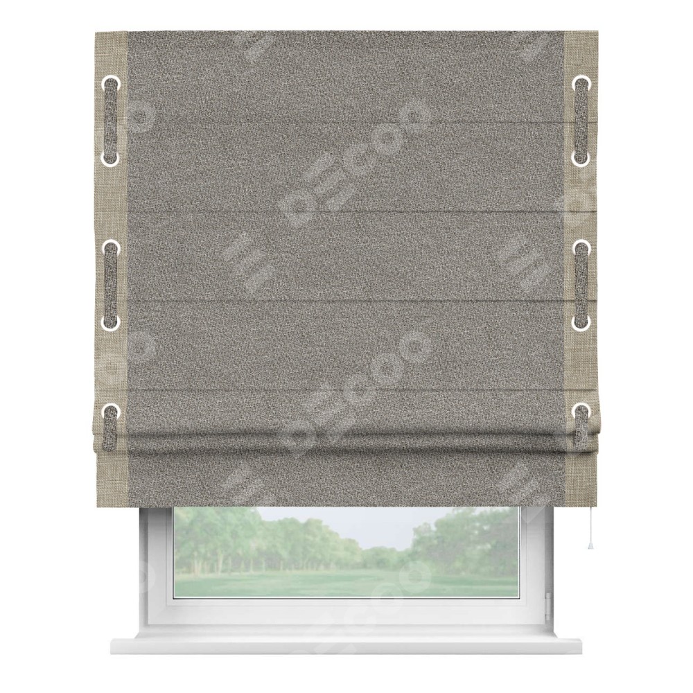 Римская штора «Кортин» для проёма, лён меланж натуральный, с кантом Стрим Дуо (люверсы с пояском)