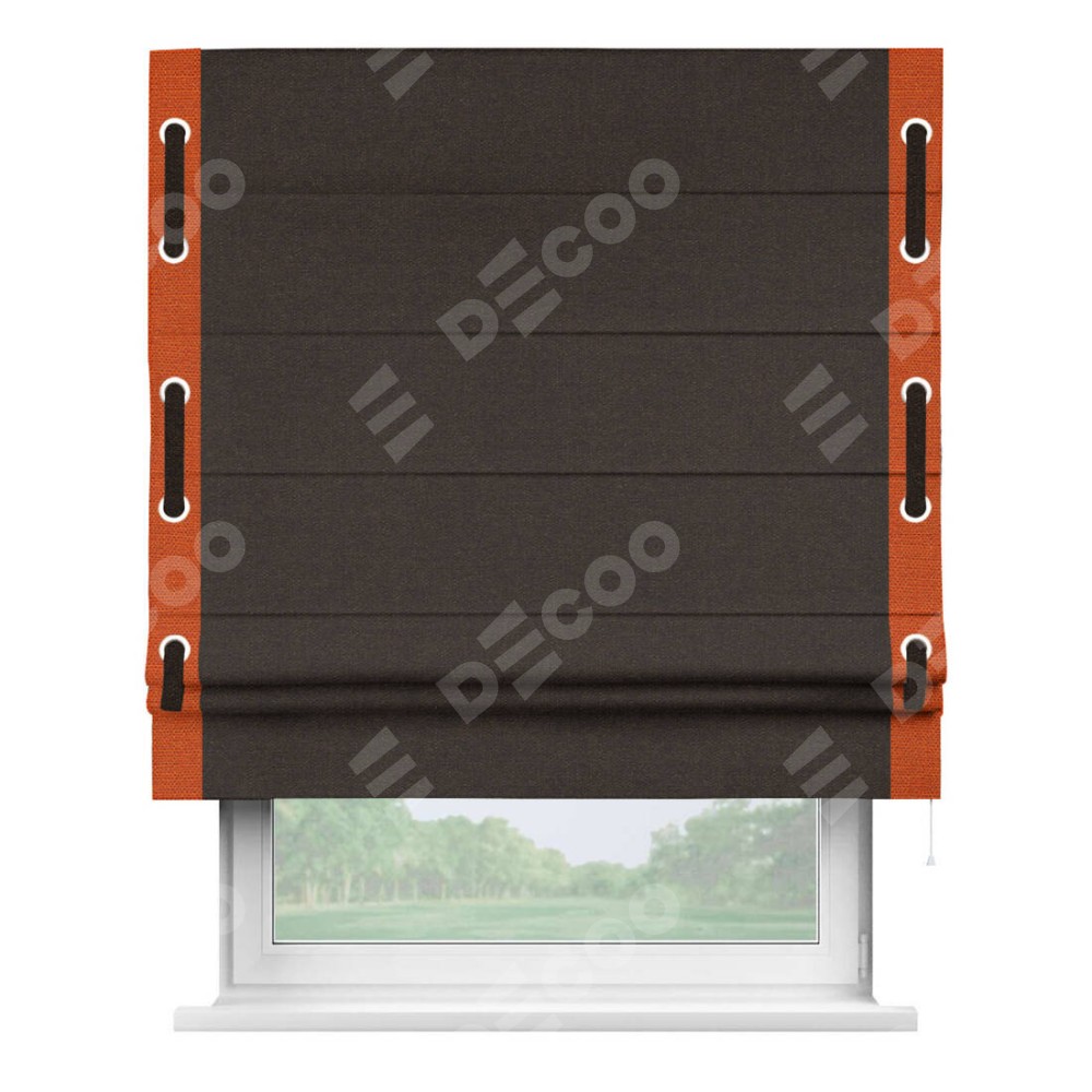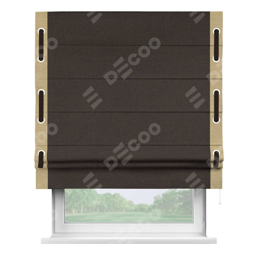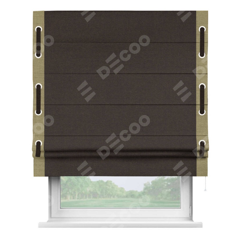 Римская штора «Кортин» для проёма, лён тёмно-коричневый, с кантом Стрим Дуо (люверсы с пояском)