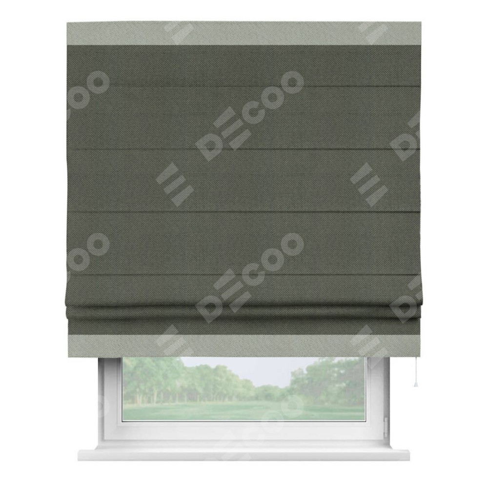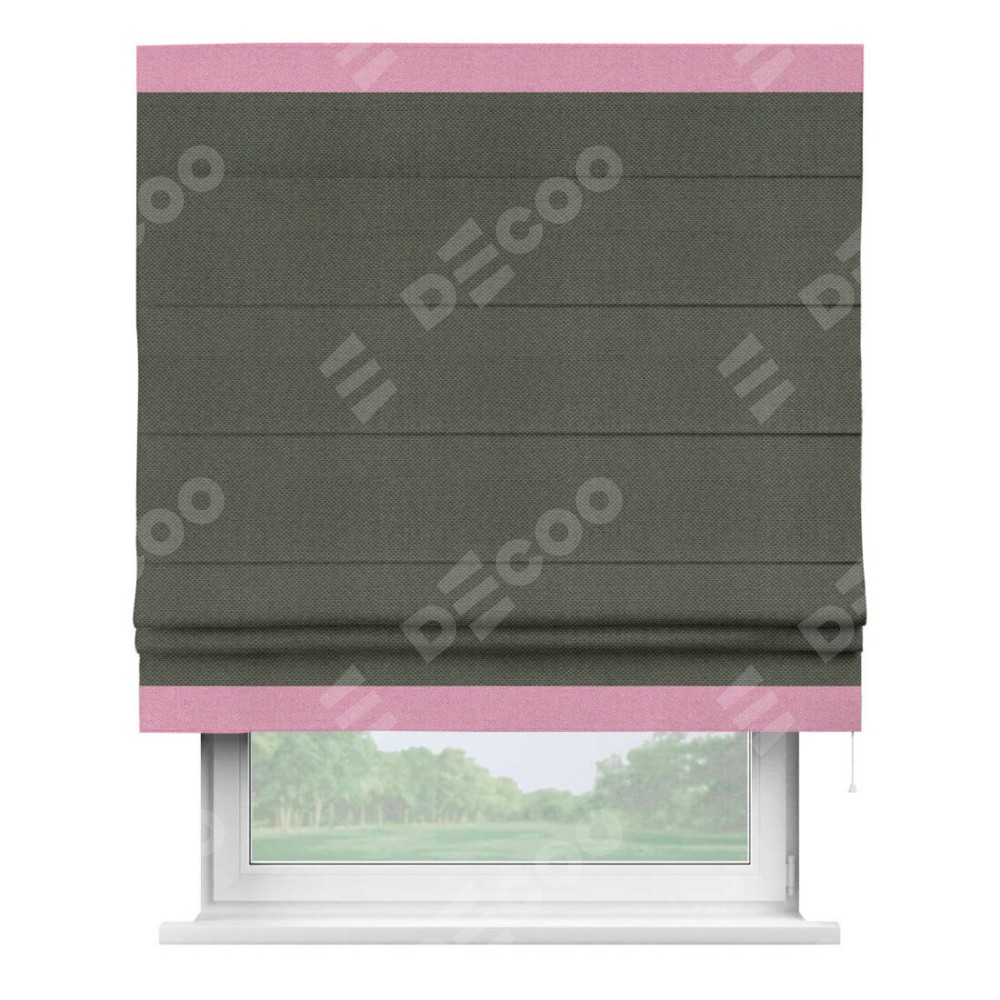 Римская штора производителя «Cortin», используется для проёма, пошита из ткани лён димаут графит, артикул 27. Отделка шторы кантом «Горизонт», ткань для канта используется из льна димаут разной расцветки на выбор. Имеет универсальный механизм и подходит для монтажа: на потолок, на стену и в нишу.