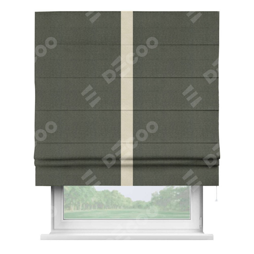 Римская штора производителя «Cortin», используется для проёма, пошита из ткани лён димаут графит, артикул 27. Отделка шторы кантом «Хайвэй», ткань для канта используется из льна димаут разной расцветки на выбор. Имеет универсальный механизм и подходит для монтажа: на потолок, на стену и в нишу.
