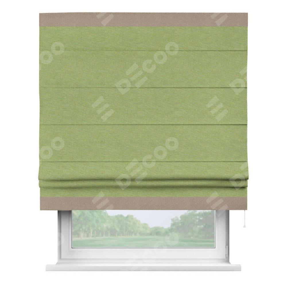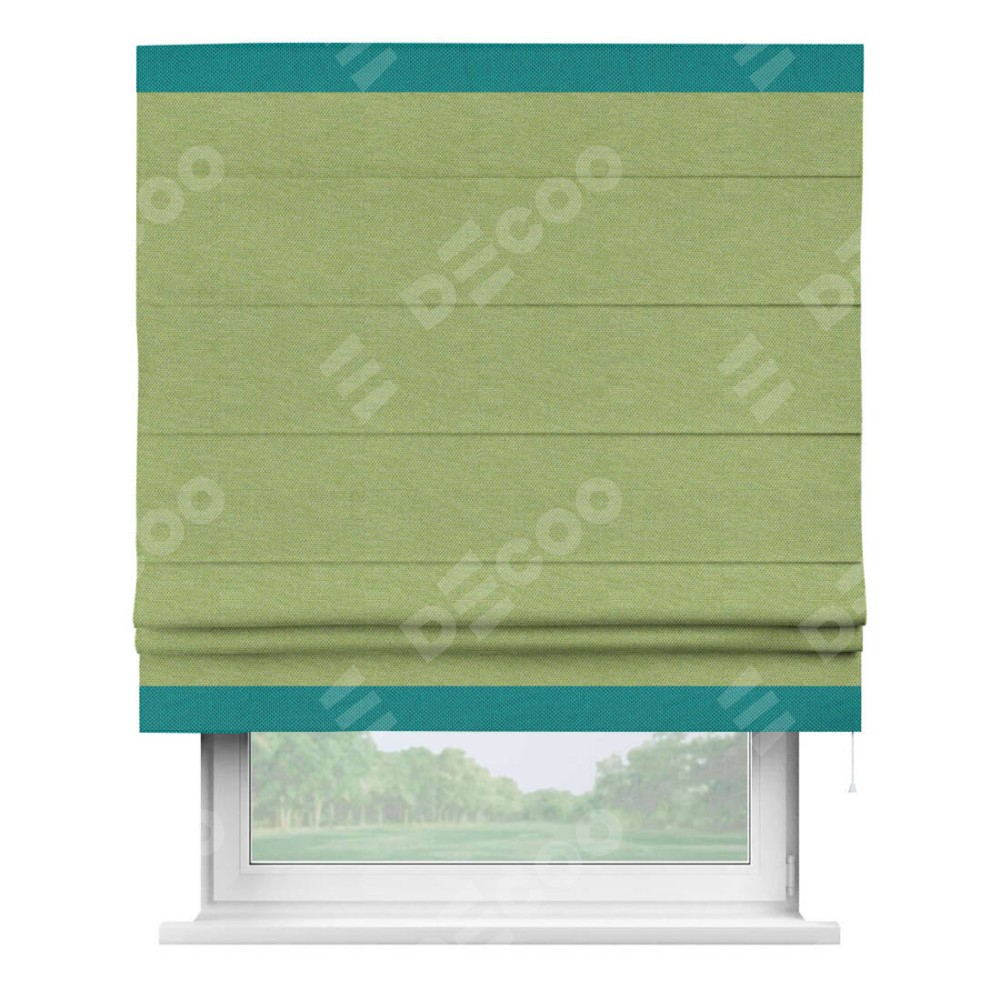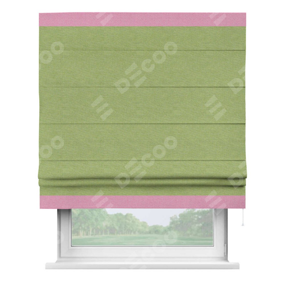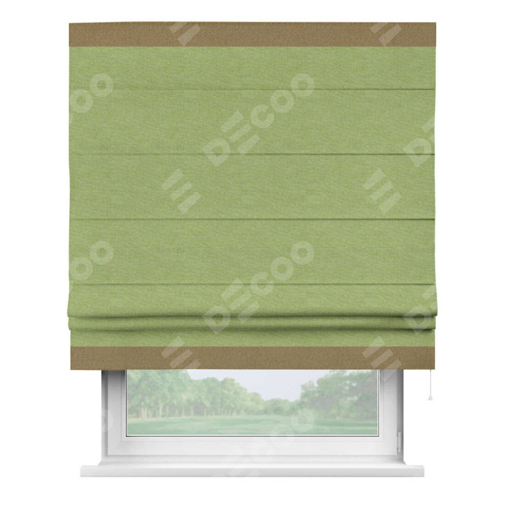 Римская штора производителя «Cortin», используется для проёма, пошита из ткани лён димаут салатовый, артикул 83032. Отделка шторы кантом «Горизонт», ткань для канта используется из льна димаут разной расцветки на выбор. Имеет универсальный механизм и подходит для монтажа: на потолок, на стену и в нишу.