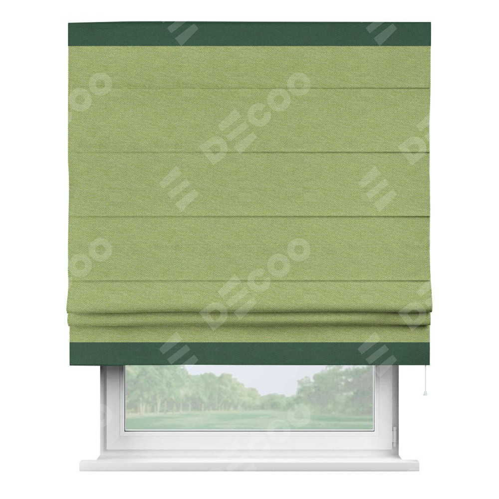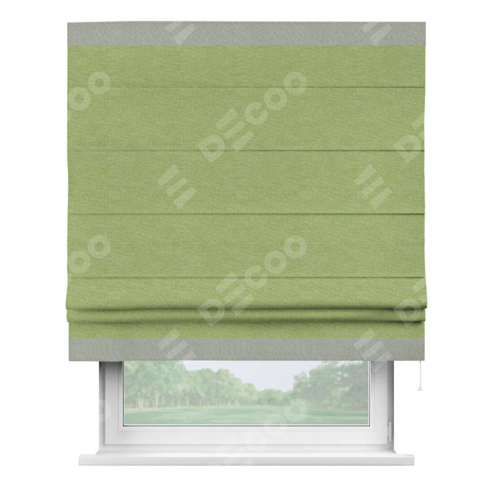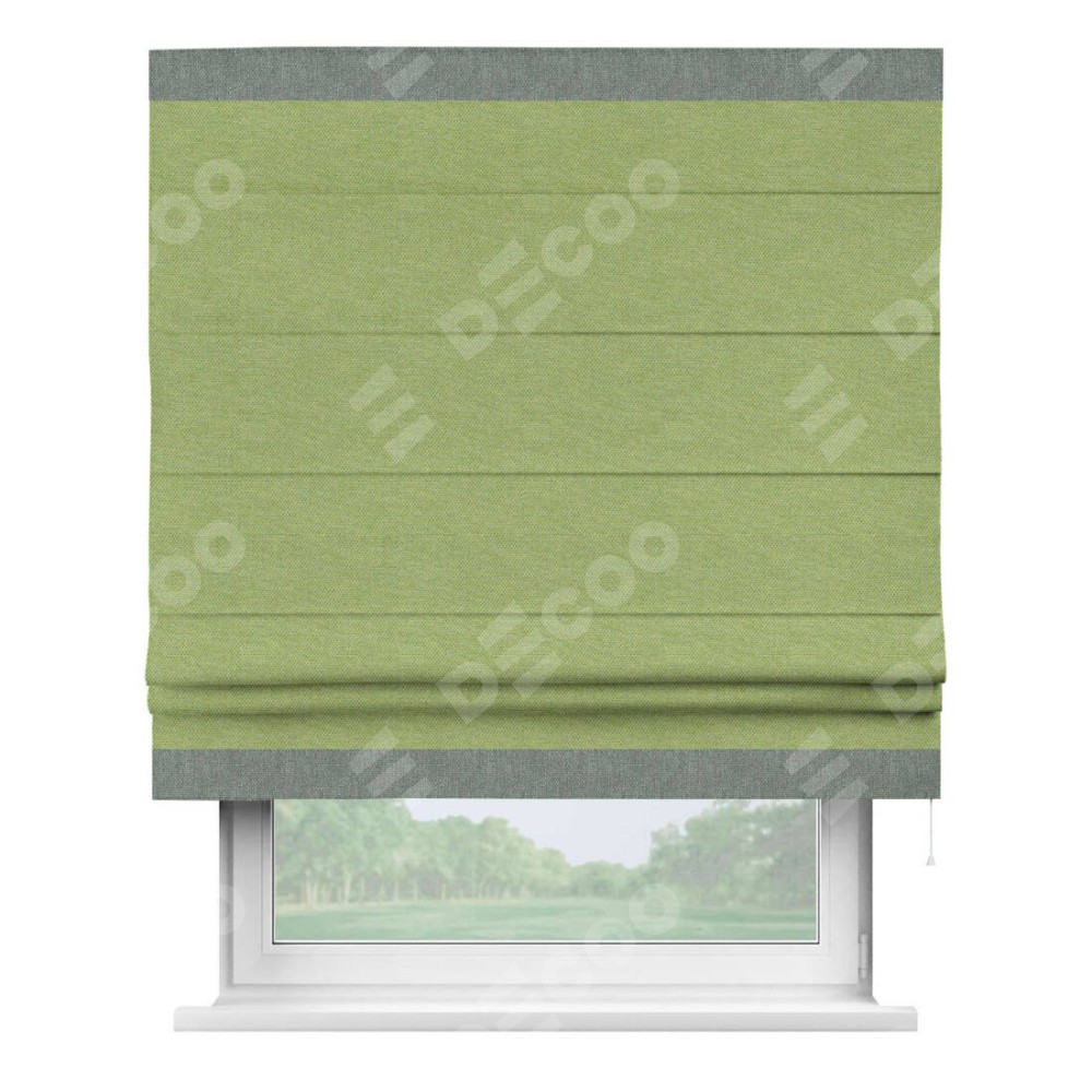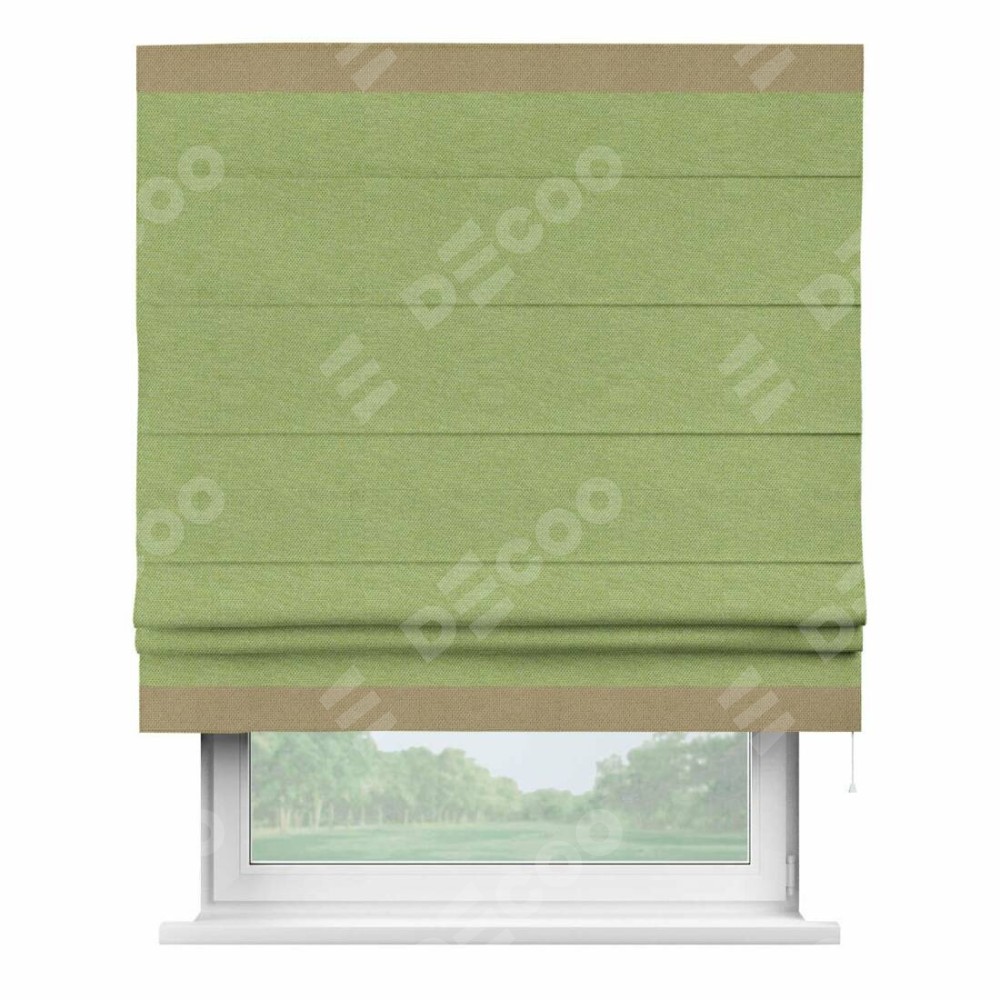 Римская штора производителя «Cortin», используется для проёма, пошита из ткани лён димаут салатовый, артикул 83032. Отделка шторы кантом «Горизонт», ткань для канта используется из льна димаут разной расцветки на выбор. Имеет универсальный механизм и подходит для монтажа: на потолок, на стену и в нишу.