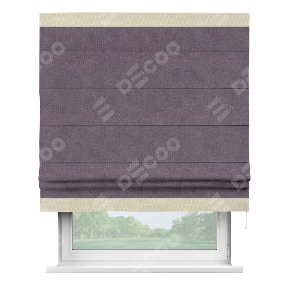 Римская штора производителя «Cortin», используется для проёма, пошита из ткани лён димаут светло-фиолетовый, артикул 83034. Отделка шторы кантом «Горизонт», ткань для канта используется из льна димаут разной расцветки на выбор. Имеет универсальный механизм и подходит для монтажа: на потолок, на стену и в нишу.