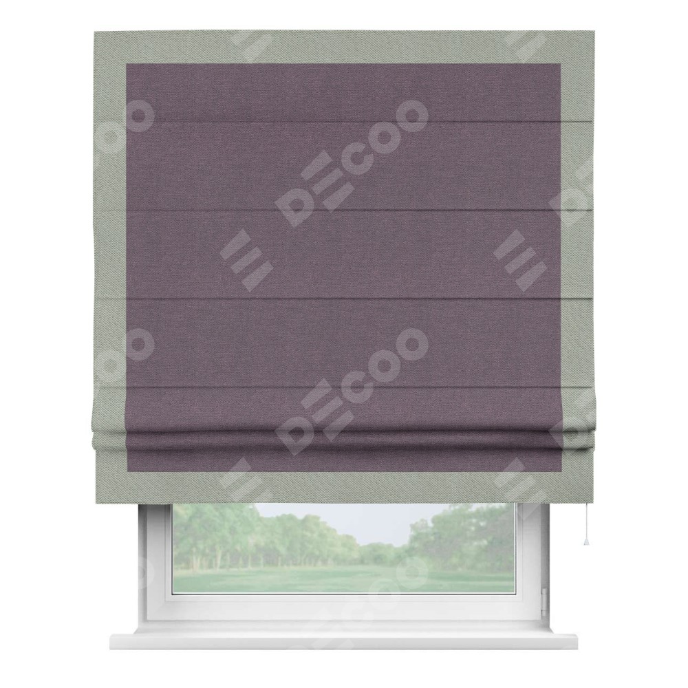 Римская штора производителя «Cortin», используется для проёма, пошита из ткани лён димаут светло-фиолетовый, артикул 83034. Отделка шторы кантом «Чесс», ткань для канта используется из льна димаут разной расцветки на выбор. Имеет универсальный механизм и подходит для монтажа: на потолок, на стену и в нишу.