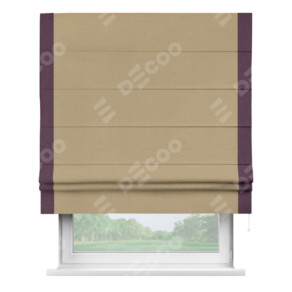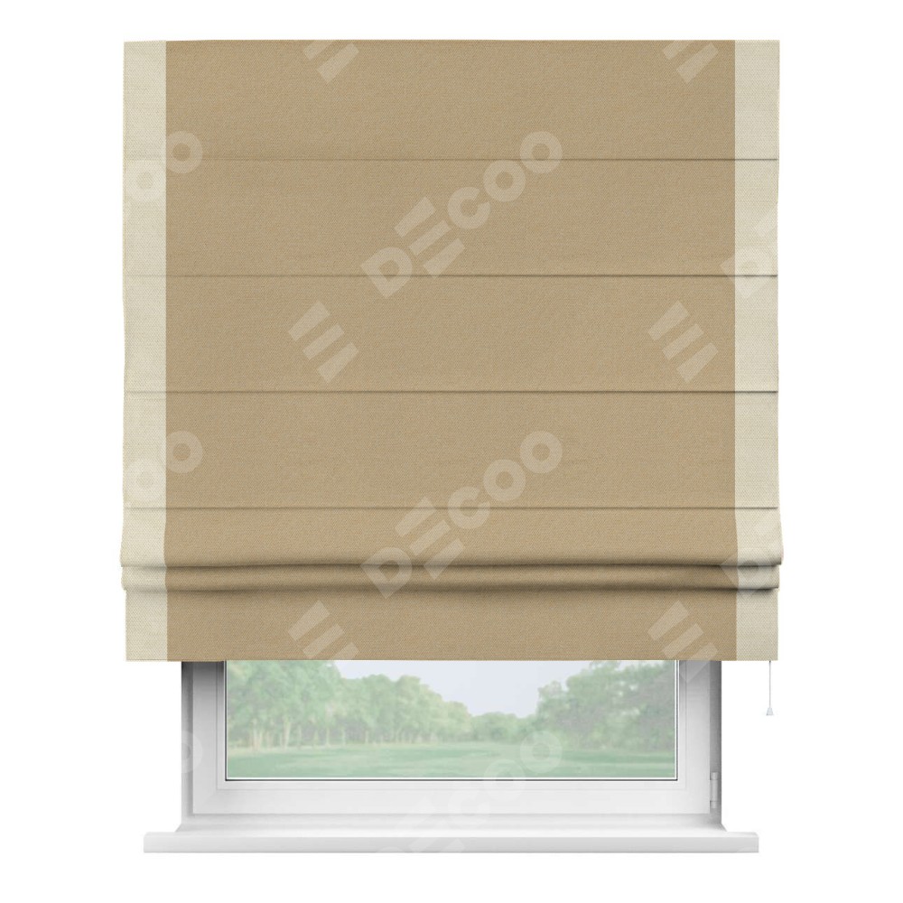 Римская штора производителя «Cortin», используется для проёма, пошита из ткани лён димаут тёмно-бежевый, артикул 83037. Отделка шторы кантом «Стрим Дуо», ткань для канта используется из льна димаут разной расцветки на выбор. Имеет универсальный механизм и подходит для монтажа: на потолок, на стену и в нишу.