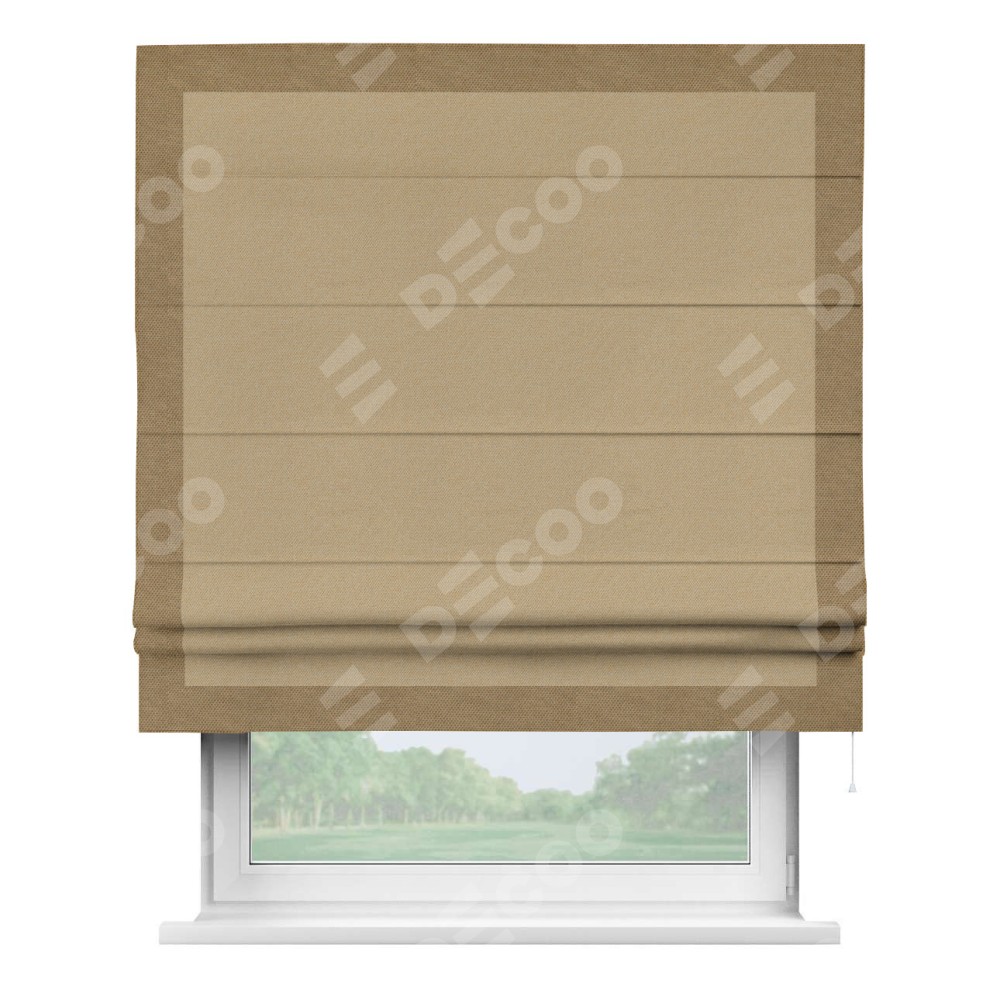 Римская штора производителя «Cortin», используется для проёма, пошита из ткани лён димаут тёмно-бежевый, артикул 83037. Отделка шторы кантом «Чесс», ткань для канта используется из льна димаут разной расцветки на выбор. Имеет универсальный механизм и подходит для монтажа: на потолок, на стену и в нишу.