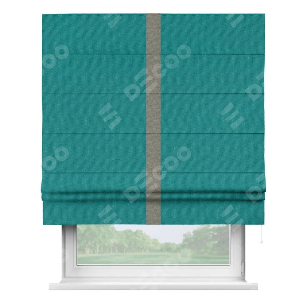 Римская штора производителя «Cortin», используется для проёма, пошита из ткани лён димаут тёмно-бирюзовый, артикул 318. Отделка шторы кантом «Хайвэй», ткань для канта используется из льна димаут разной расцветки на выбор. Имеет универсальный механизм и подходит для монтажа: на потолок, на стену и в нишу.
