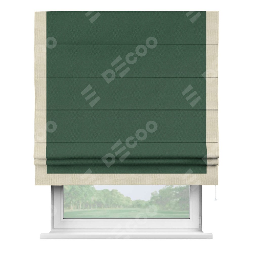 Римская штора производителя «Cortin», используется для проёма, пошита из ткани лён димаут тёмно-зелёный, артикул 16246. Отделка шторы кантом «Виктория», ткань для канта используется из льна димаут разной расцветки на выбор. Имеет универсальный механизм и подходит для монтажа: на потолок, на стену и в нишу.