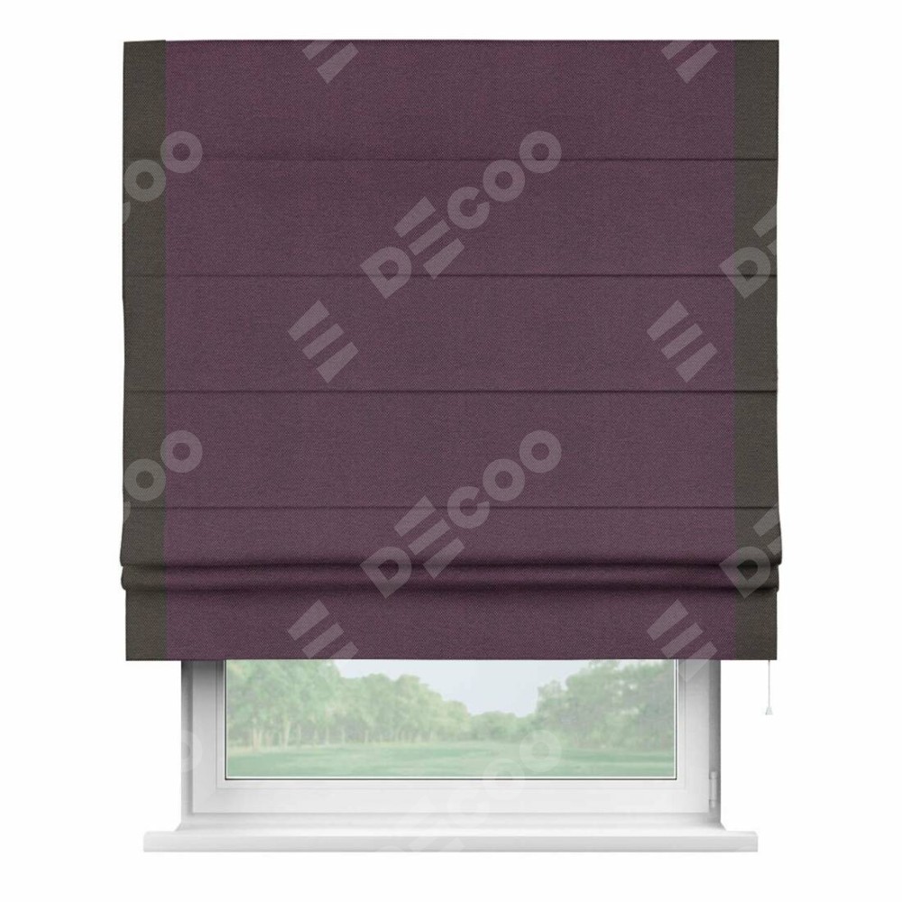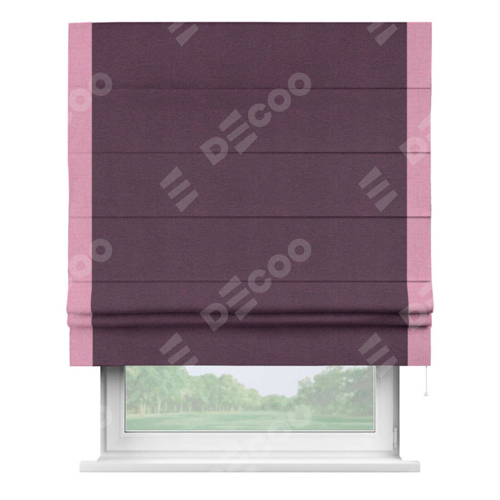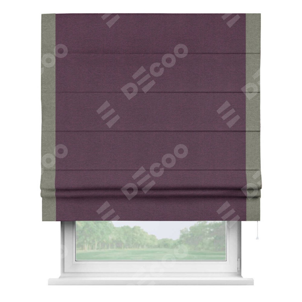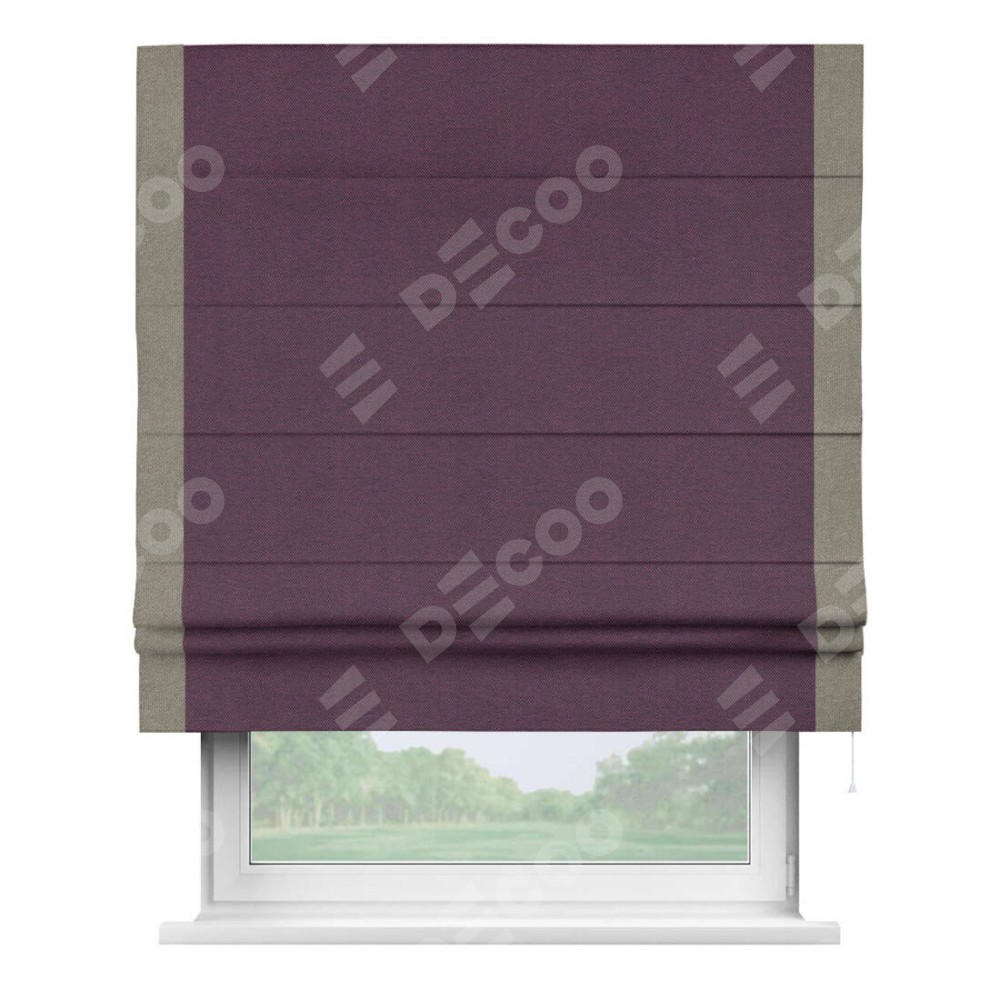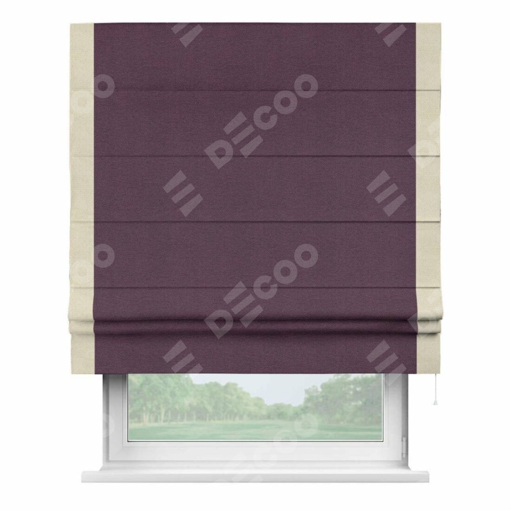 Римская штора производителя «Cortin», используется для проёма, пошита из ткани лён димаут фиолетовый, артикул 8817. Отделка шторы кантом «Стрим Дуо», ткань для канта используется из льна димаут разной расцветки на выбор. Имеет универсальный механизм и подходит для монтажа: на потолок, на стену и в нишу.