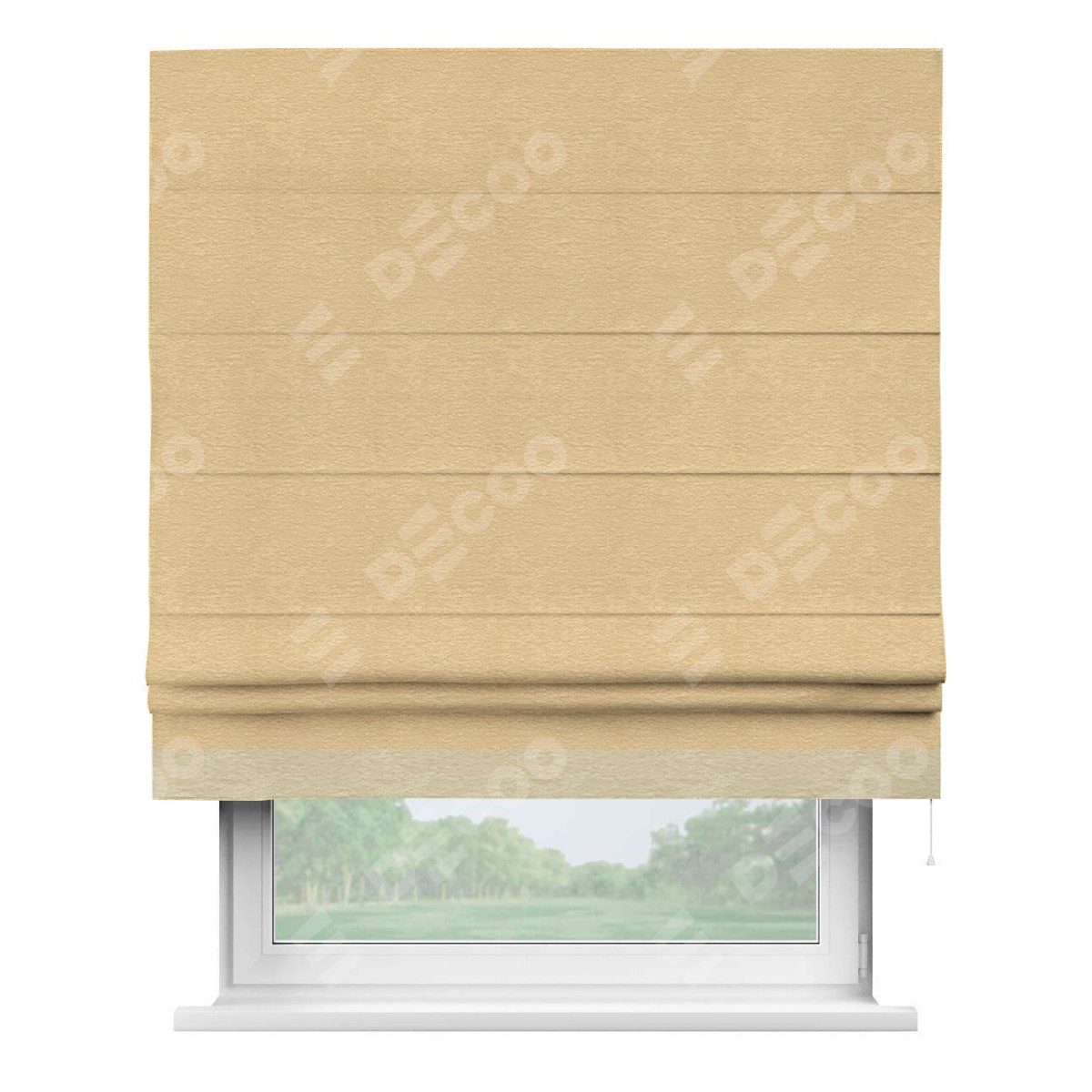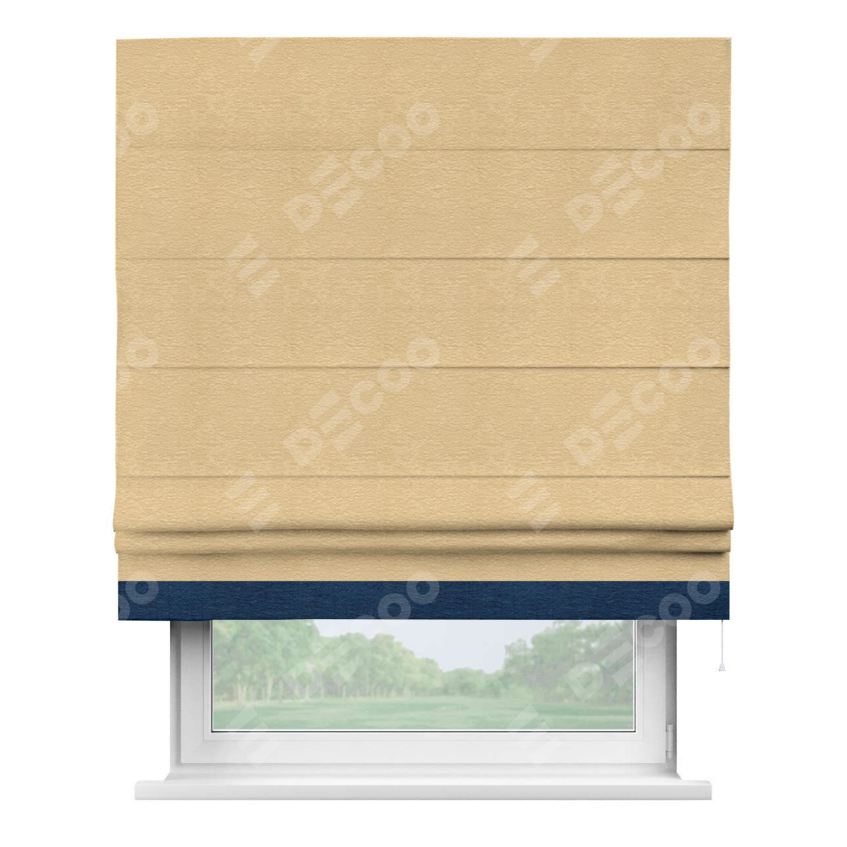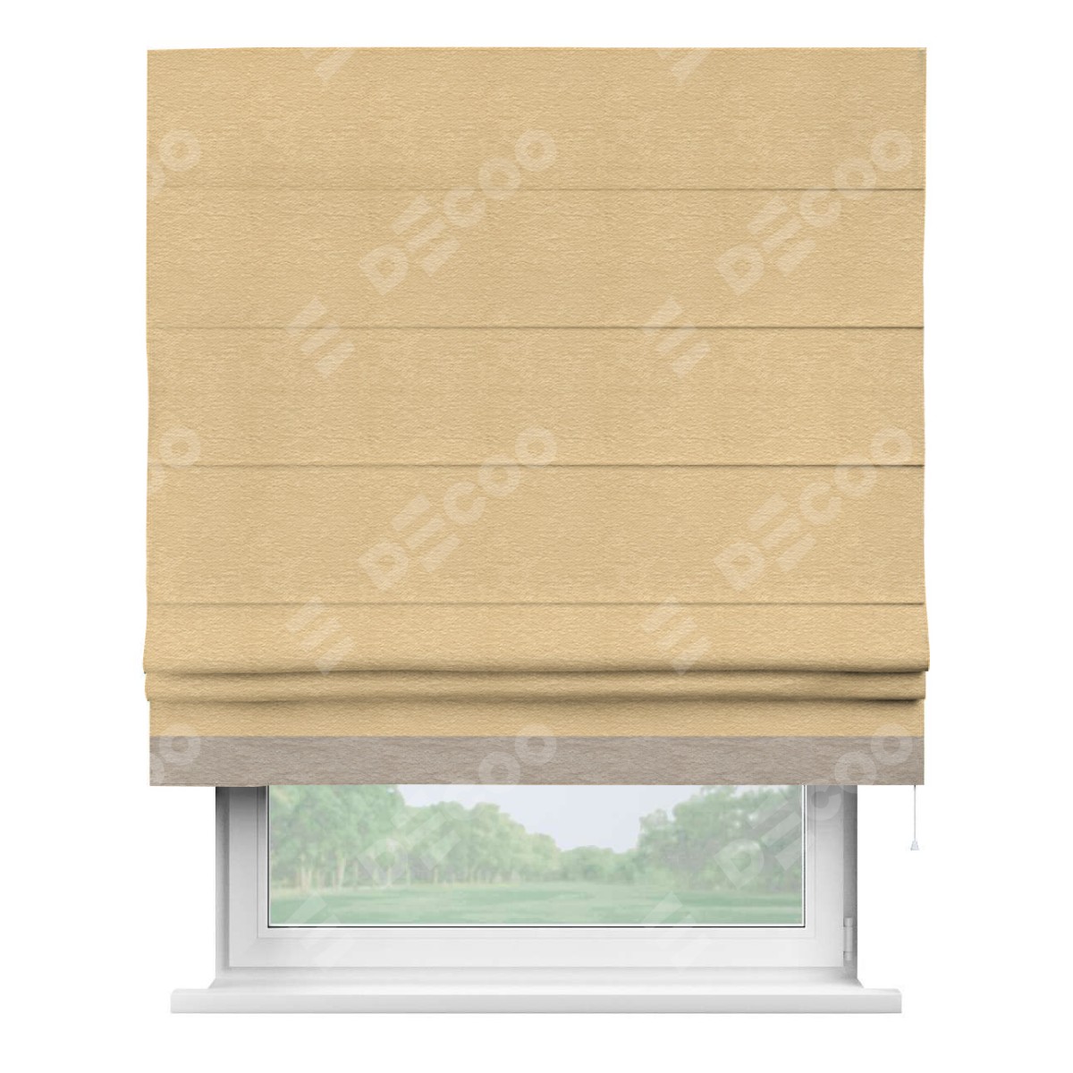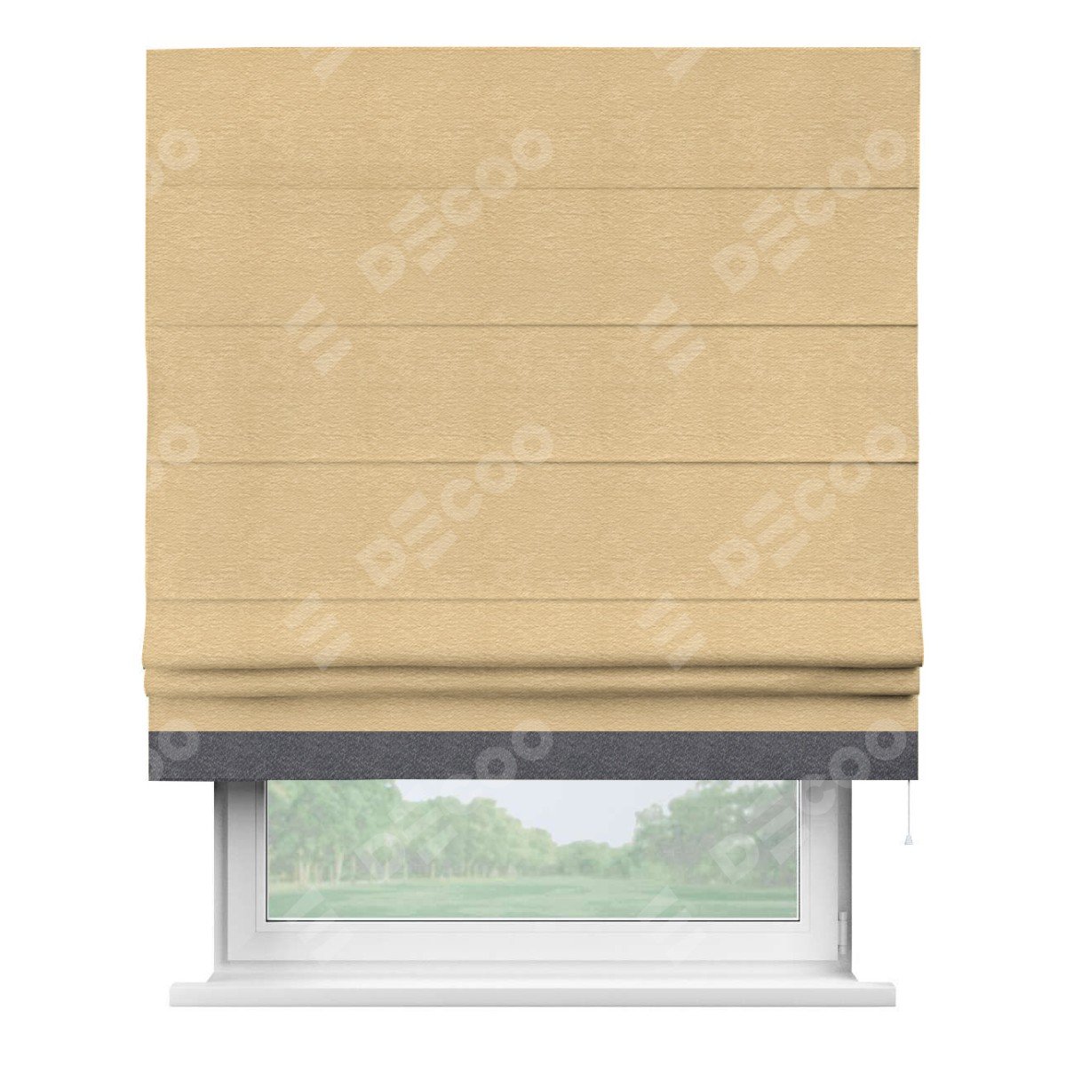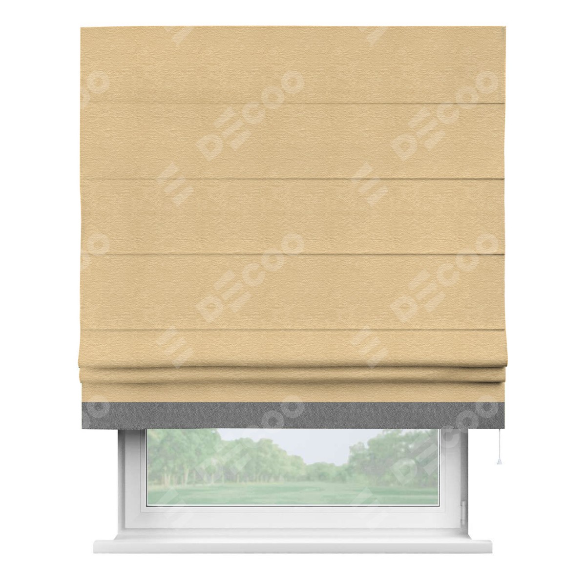 Римская штора производителя «Cortin», используется для проёма, пошита из ткани софт однотонный бежевый, артикул 4202 05. Отделка шторы кантом «Джестер», ткань для канта используется из софта разной расцветки на выбор. Имеет универсальный механизм и подходит для монтажа: на потолок, на стену и в нишу.