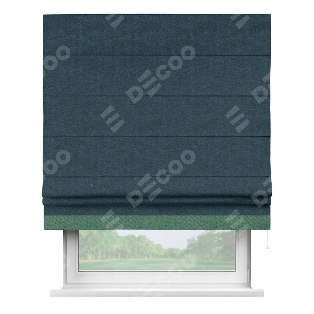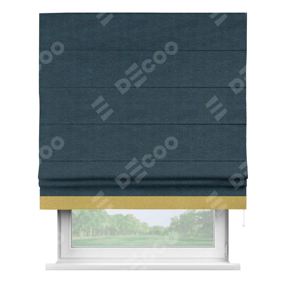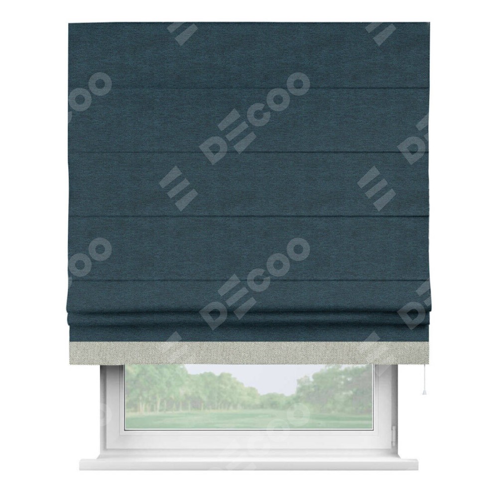 Римская штора производителя «Cortin», используется для проёма, пошита из ткани твид блэкаут глубокий синий, артикул 21590. Отделка шторы кантом «Джестер», ткань для канта используется из твида разной расцветки на выбор. Имеет универсальный механизм и подходит для монтажа: на потолок, на стену и в нишу.