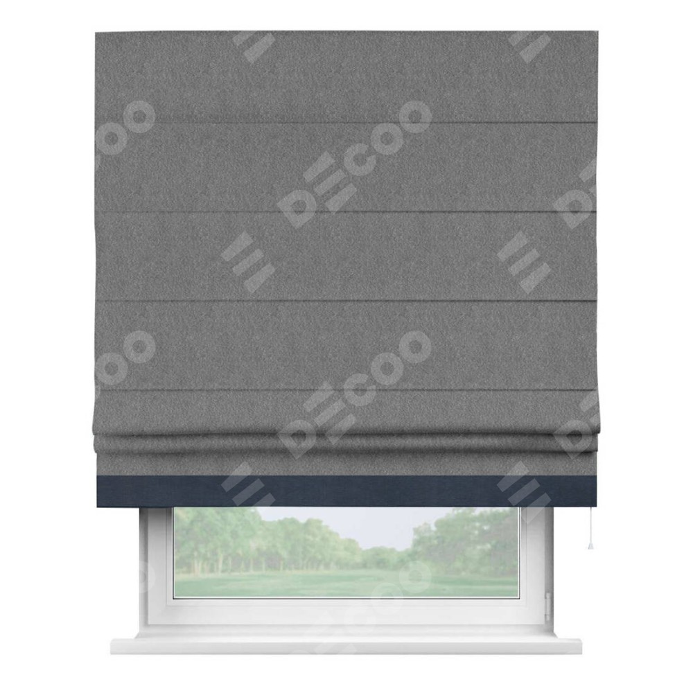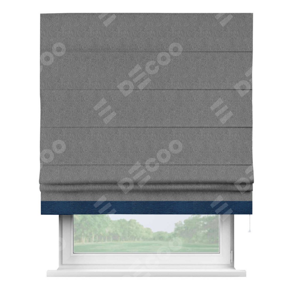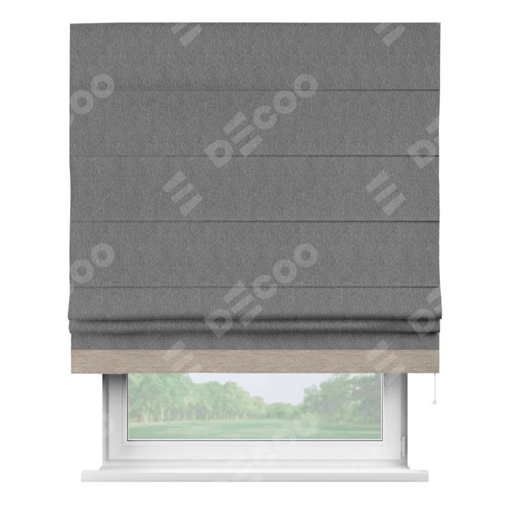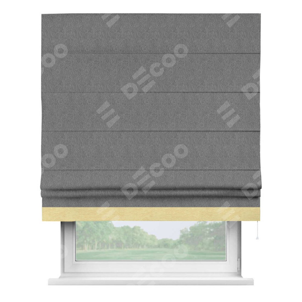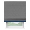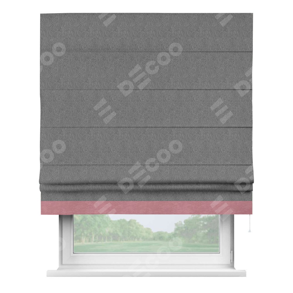 Римская штора производителя «Cortin», используется для проёма, пошита из ткани софт однотонный серый, артикул 70605. Отделка шторы кантом «Джестер», ткань для канта используется из софта разной расцветки на выбор. Имеет универсальный механизм и подходит для монтажа: на потолок, на стену и в нишу.