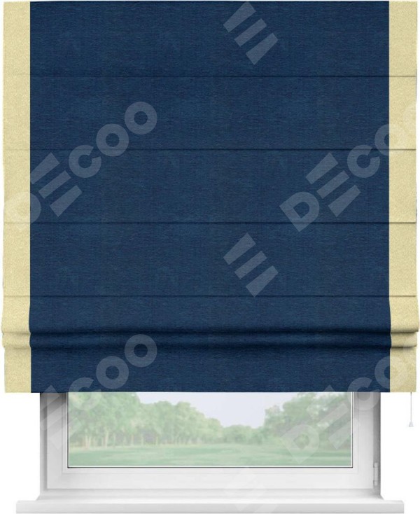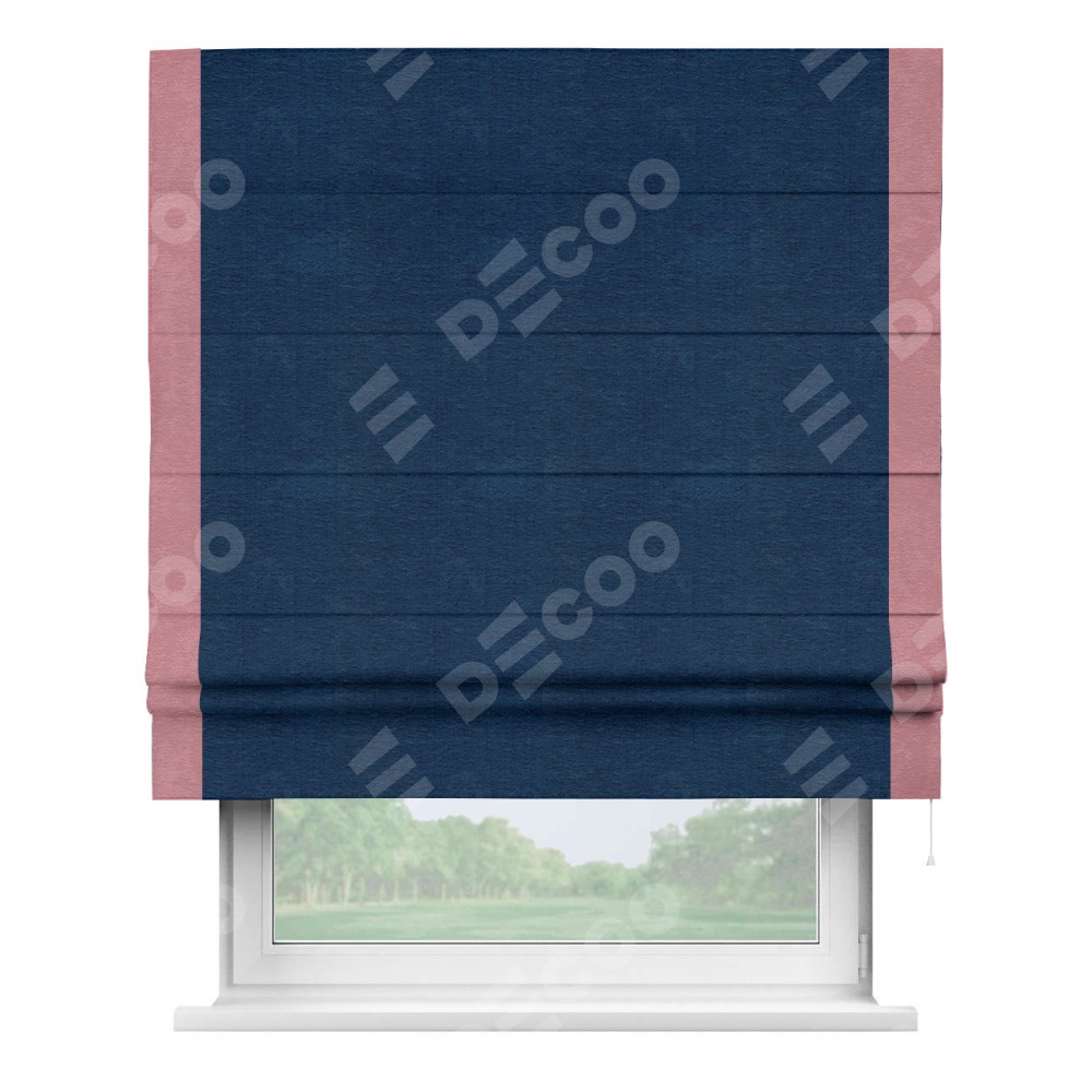 Римская штора производителя «Cortin», используется для проёма, пошита из ткани софт однотонный синий, артикул 42937. Отделка шторы кантом «Стрим Дуо», ткань для канта используется из софта разной расцветки на выбор. Имеет универсальный механизм и подходит для монтажа: на потолок, на стену и в нишу.