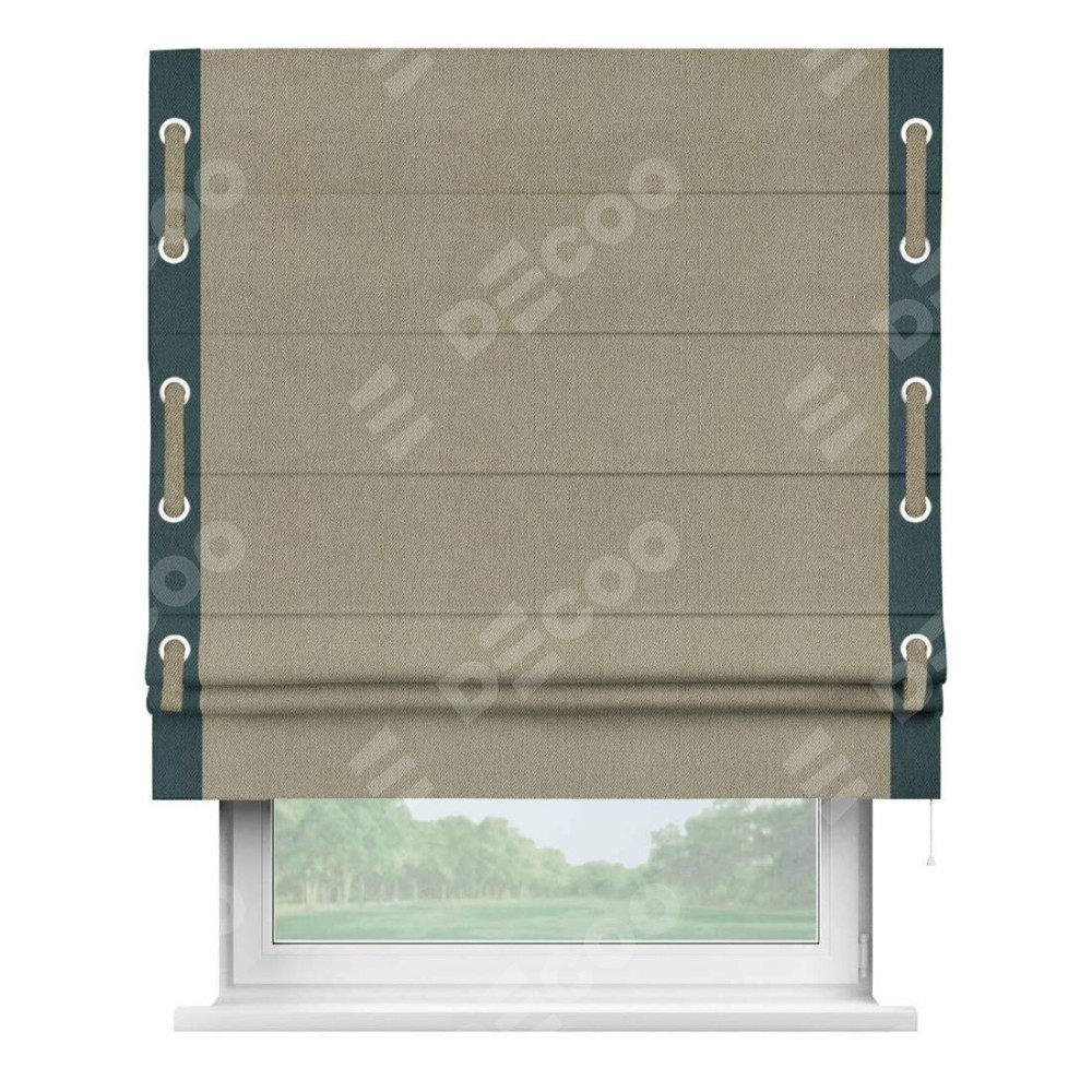 Римская штора производителя «Cortin», используется для проёма, пошита из ткани твид блэкаут кофе, артикул 21575. Отделка шторы кантом «Стрим Дуо» на кантах расположены люверсы с пояском, ткань для канта используется из твида разной расцветки на выбор. Ткань для пояска обычно используется из основной ткани шторы, а так же можно сделать из любой расцветки по желанию. Имеет универсальный механизм и подходит для монтажа: на потолок, на стену и в нишу.