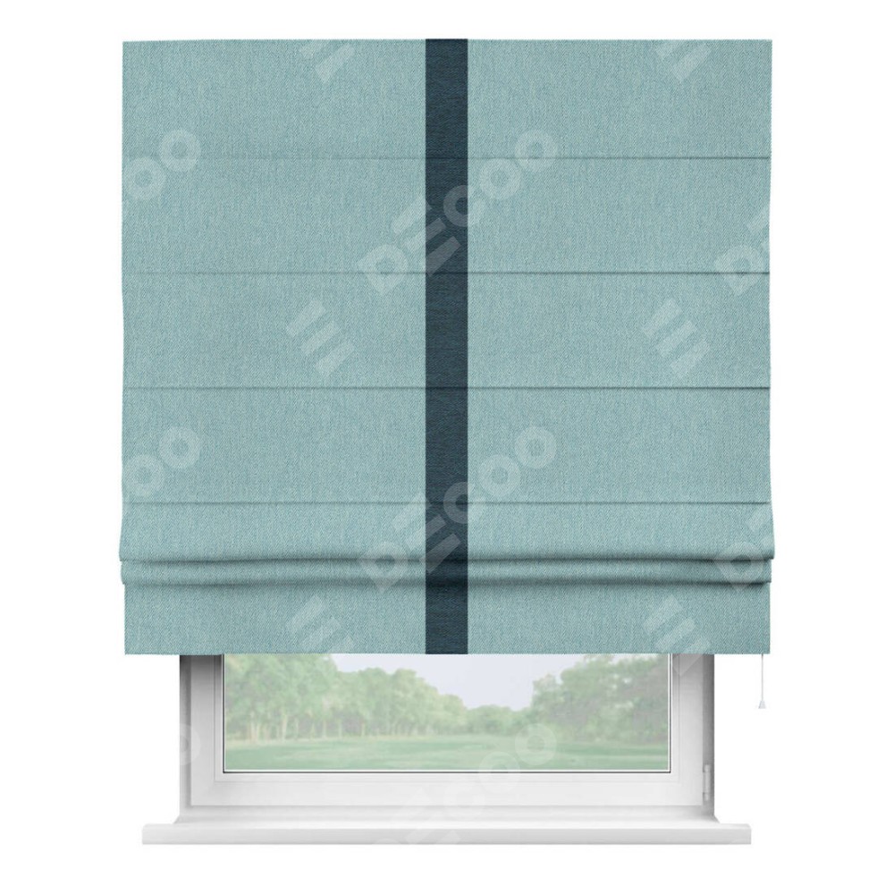 Римская штора производителя «Cortin», используется для проёма, пошита из ткани твид блэкаут небесно-голубой, артикул 21578. Отделка шторы кантом «Хайвэй», ткань для канта используется из твида разной расцветки на выбор. Имеет универсальный механизм и подходит для монтажа: на потолок, на стену и в нишу.