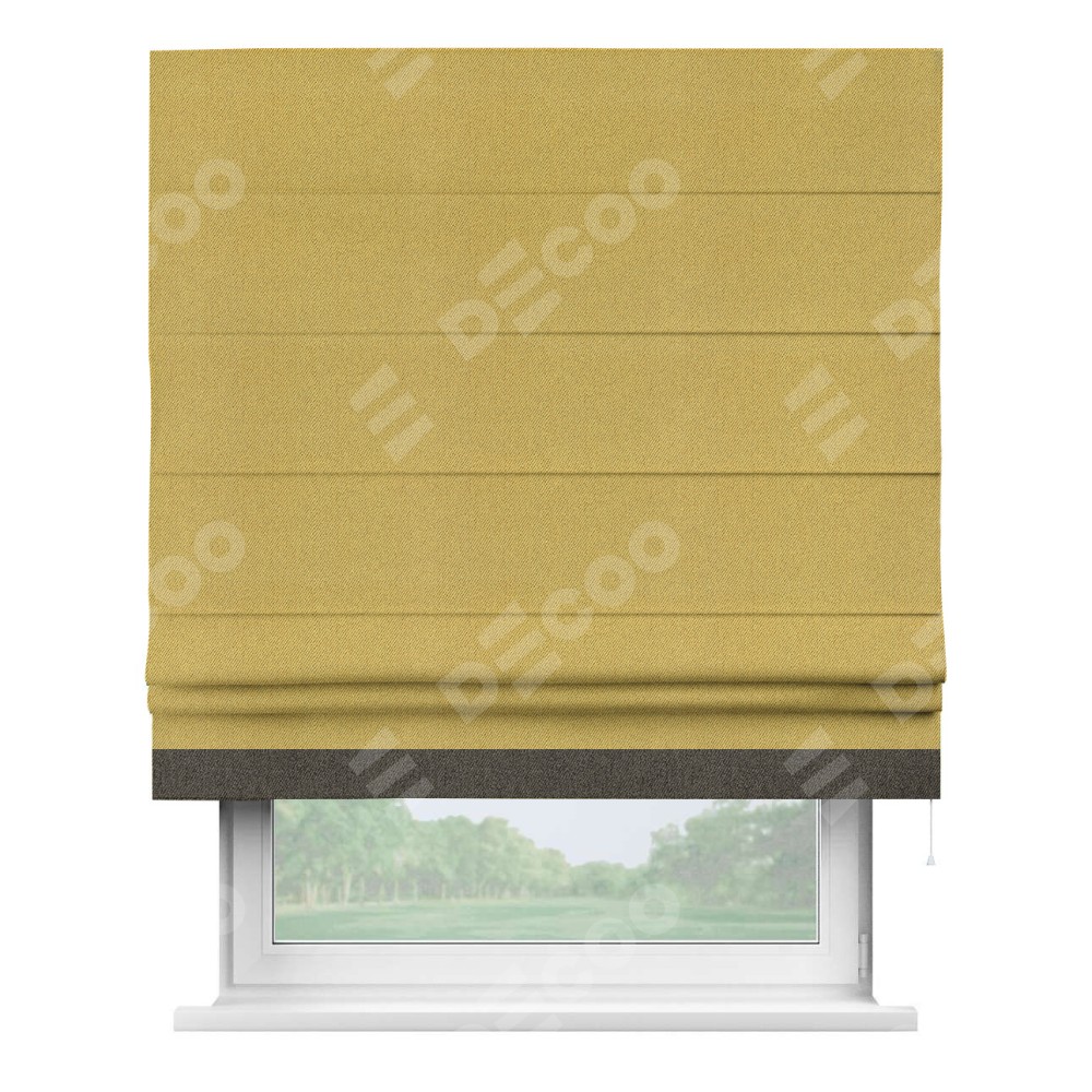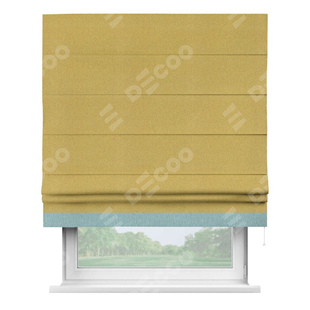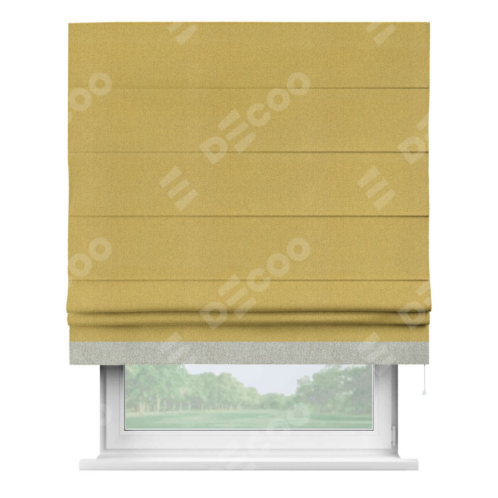 Римская штора производителя «Cortin», используется для проёма, пошита из ткани твид блэкаут пыльная горчица, артикул 21588. Отделка шторы кантом «Джестер», ткань для канта используется из твида разной расцветки на выбор. Имеет универсальный механизм и подходит для монтажа: на потолок, на стену и в нишу.