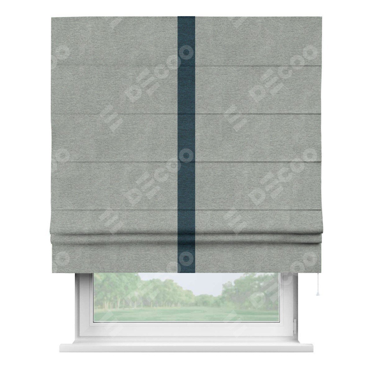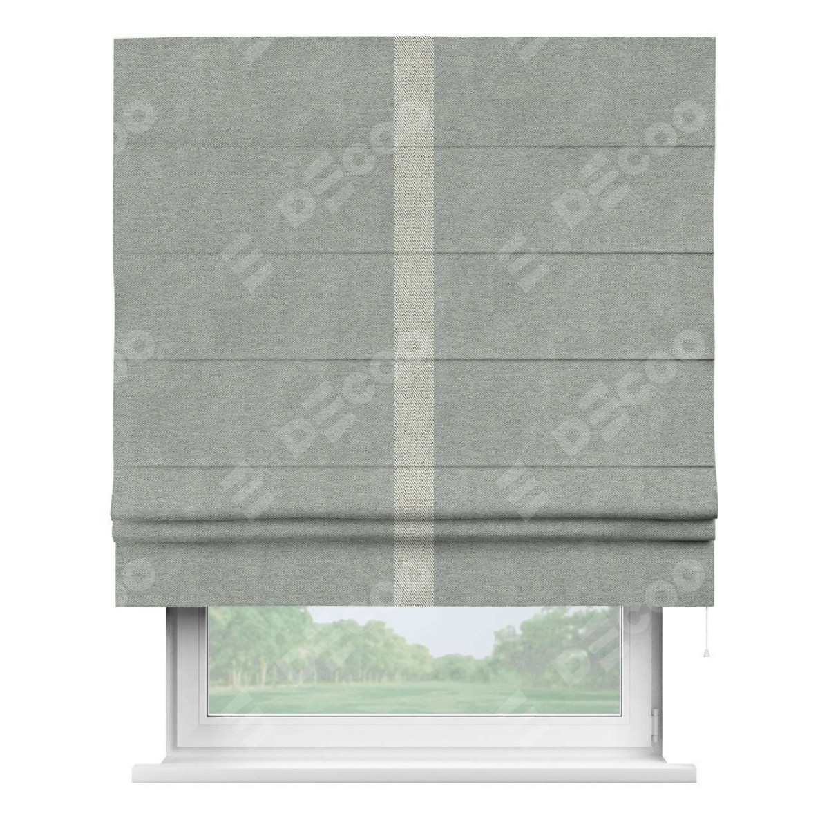 Римская штора производителя «Cortin», используется для проёма, пошита из ткани твид блэкаут светло-серый, артикул 21576. Отделка шторы кантом «Хайвэй», ткань для канта используется из твида разной расцветки на выбор. Имеет универсальный механизм и подходит для монтажа: на потолок, на стену и в нишу.
