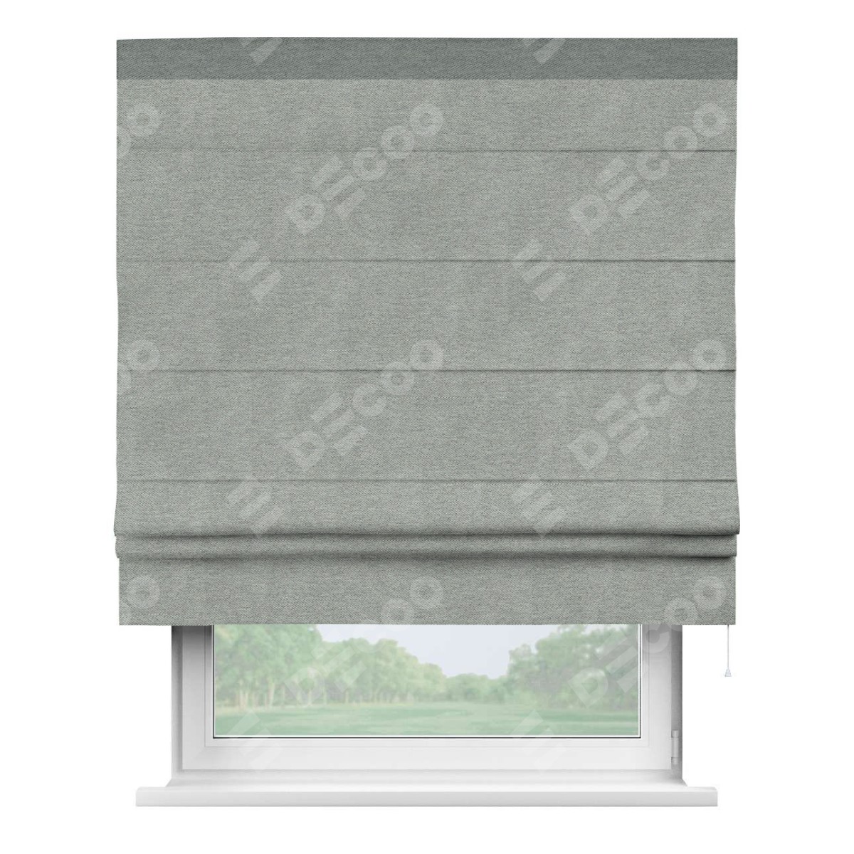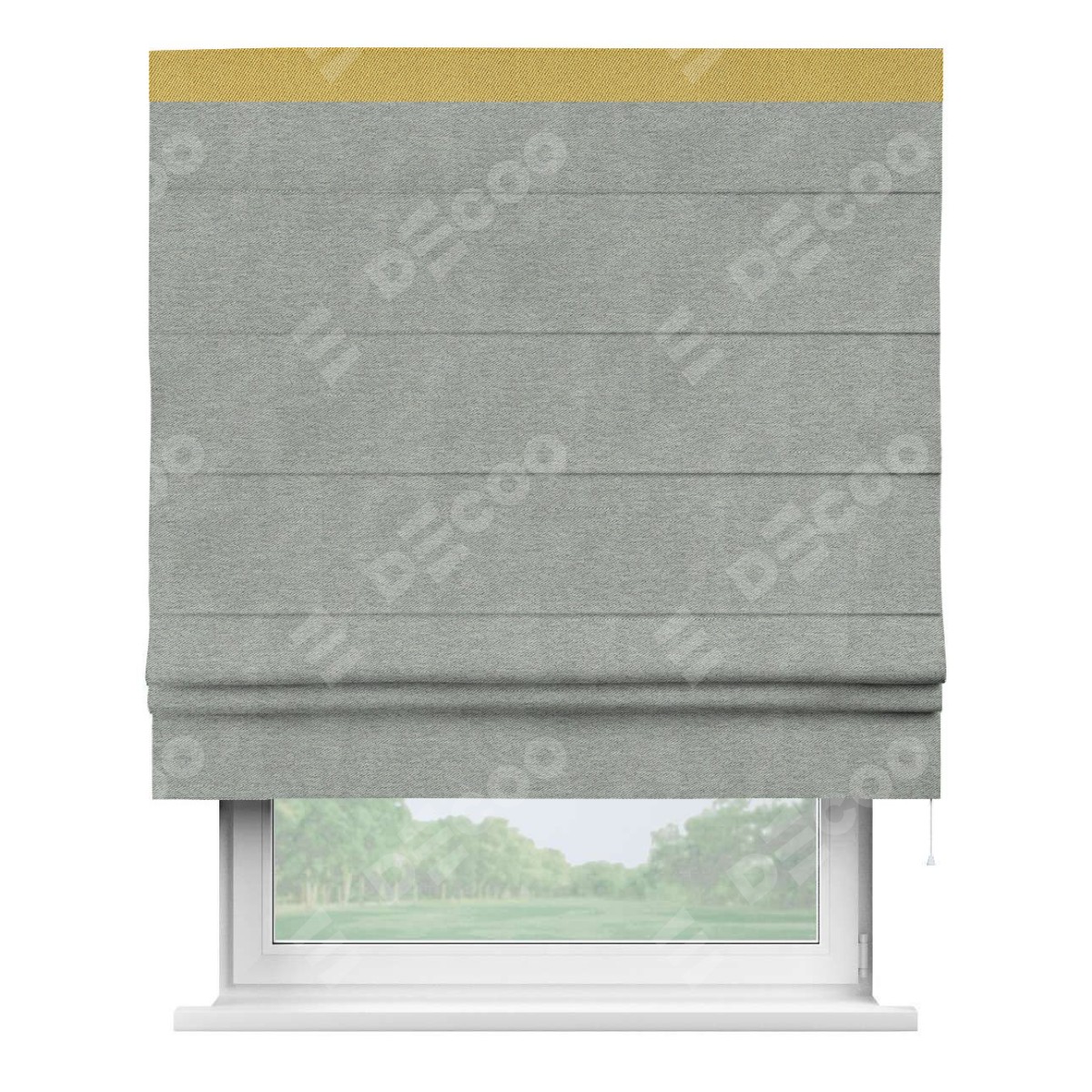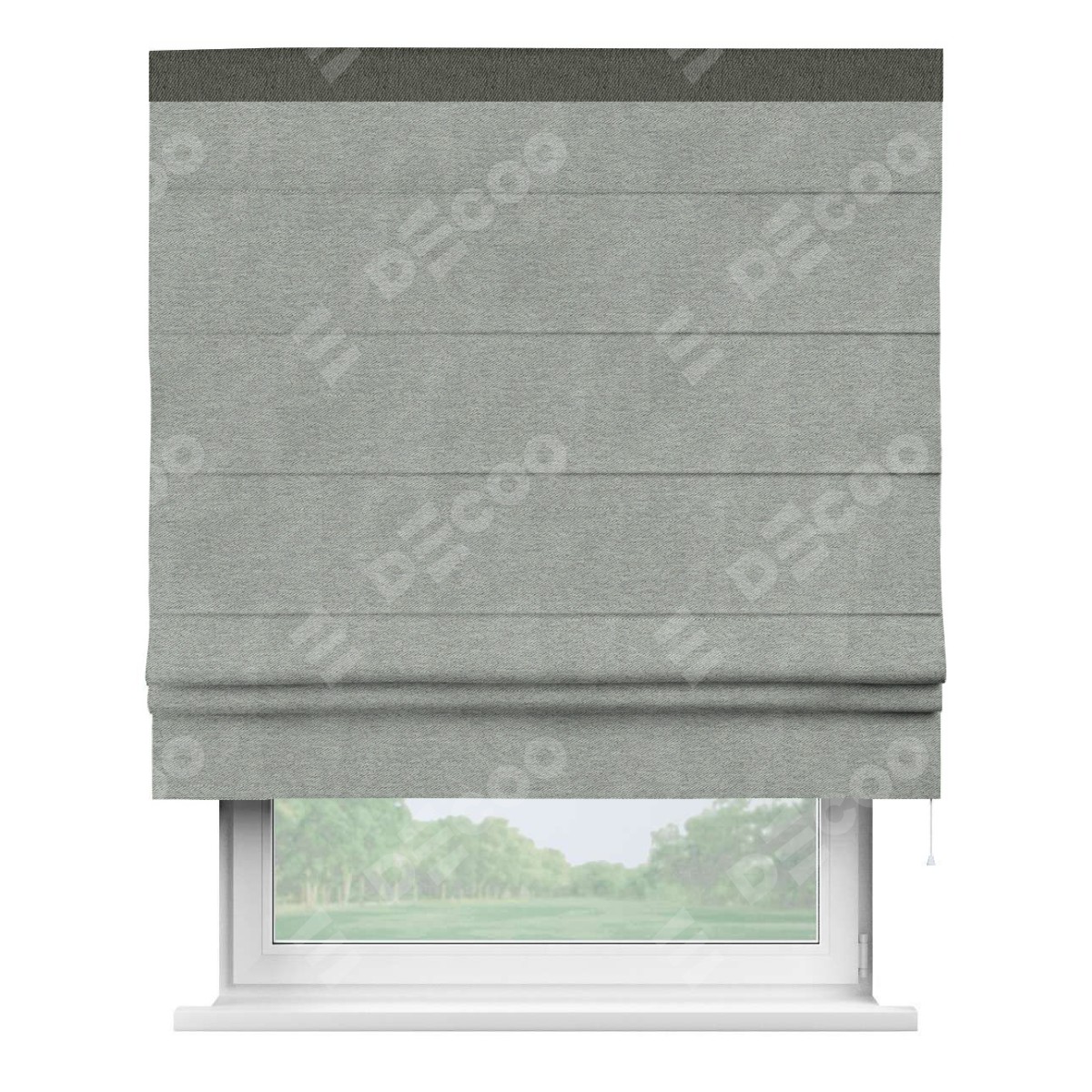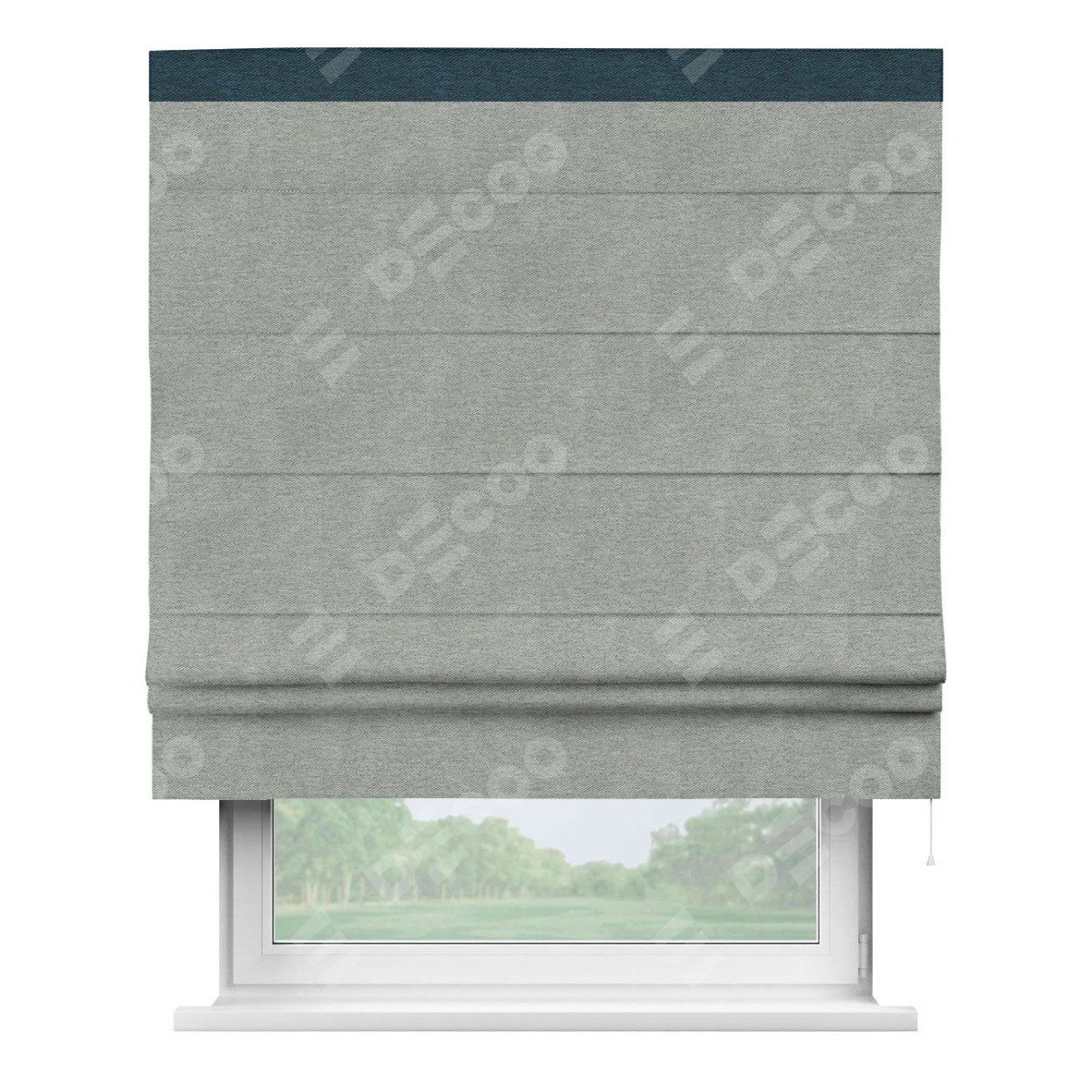 Римская штора производителя «Cortin», используется для проёма, пошита из ткани твид блэкаут светло-серый, артикул 21576. Отделка шторы кантом «Кинг», ткань для канта используется из твида разной расцветки на выбор. Имеет универсальный механизм и подходит для монтажа: на потолок, на стену и в нишу.