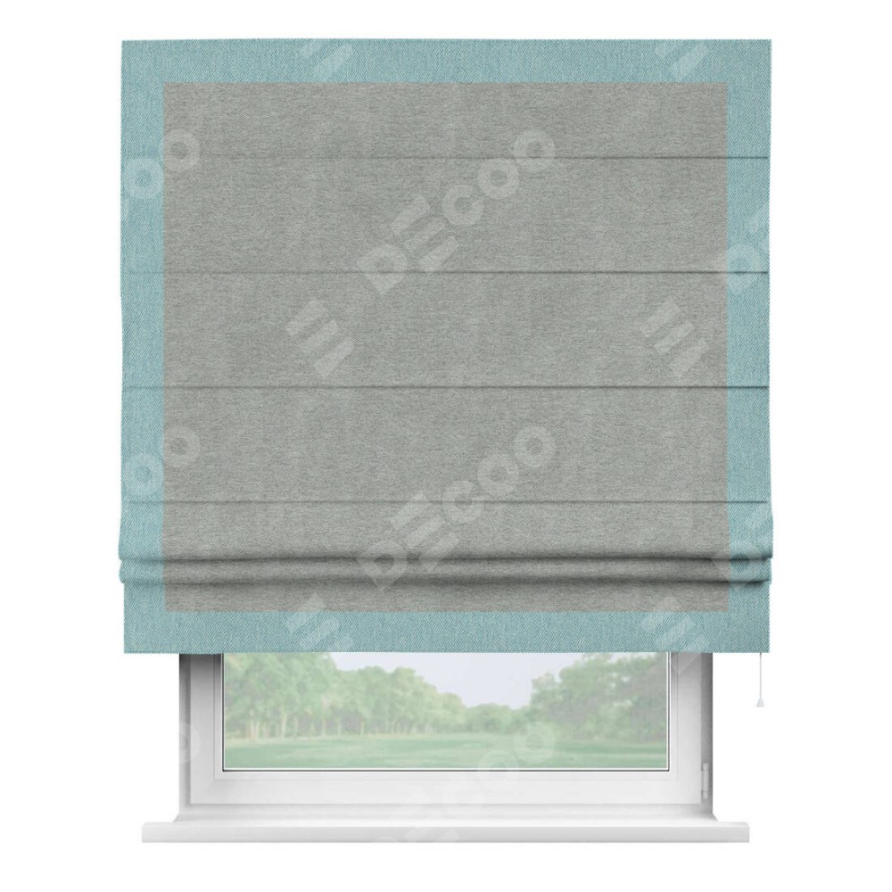 Римская штора производителя «Cortin», используется для проёма, пошита из ткани твид блэкаут светло-серый, артикул 21576. Отделка шторы кантом «Чесс», ткань для канта используется из твида разной расцветки на выбор. Имеет универсальный механизм и подходит для монтажа: на потолок, на стену и в нишу.