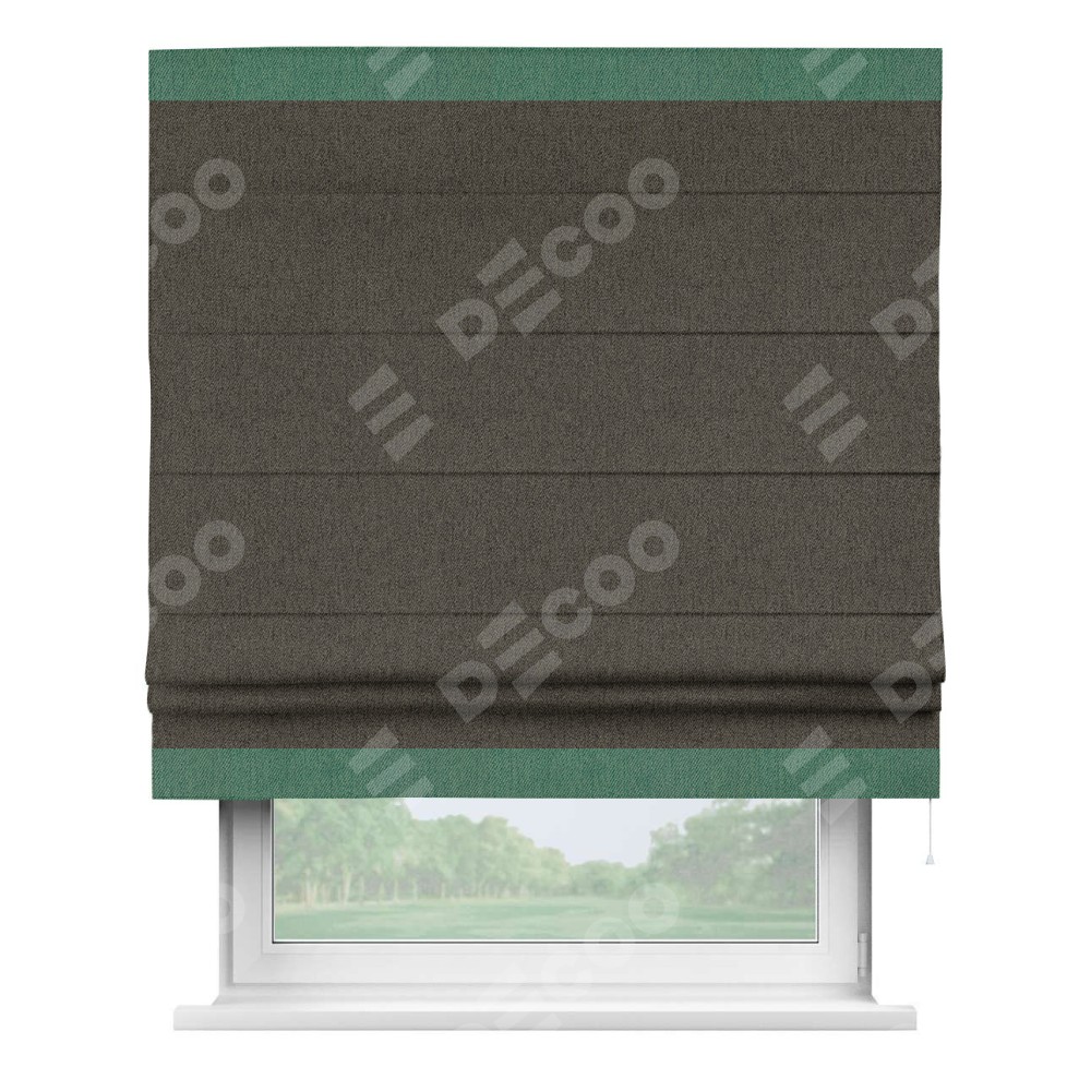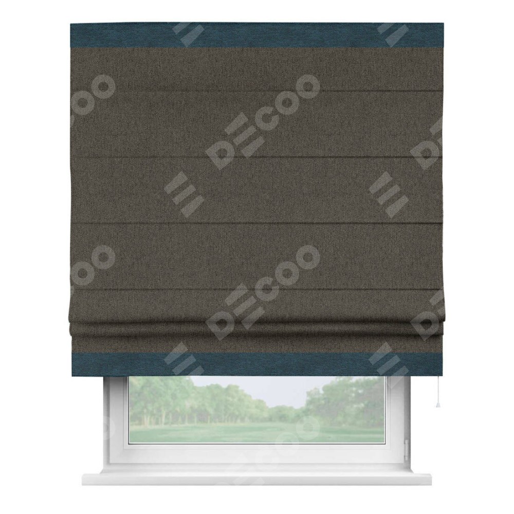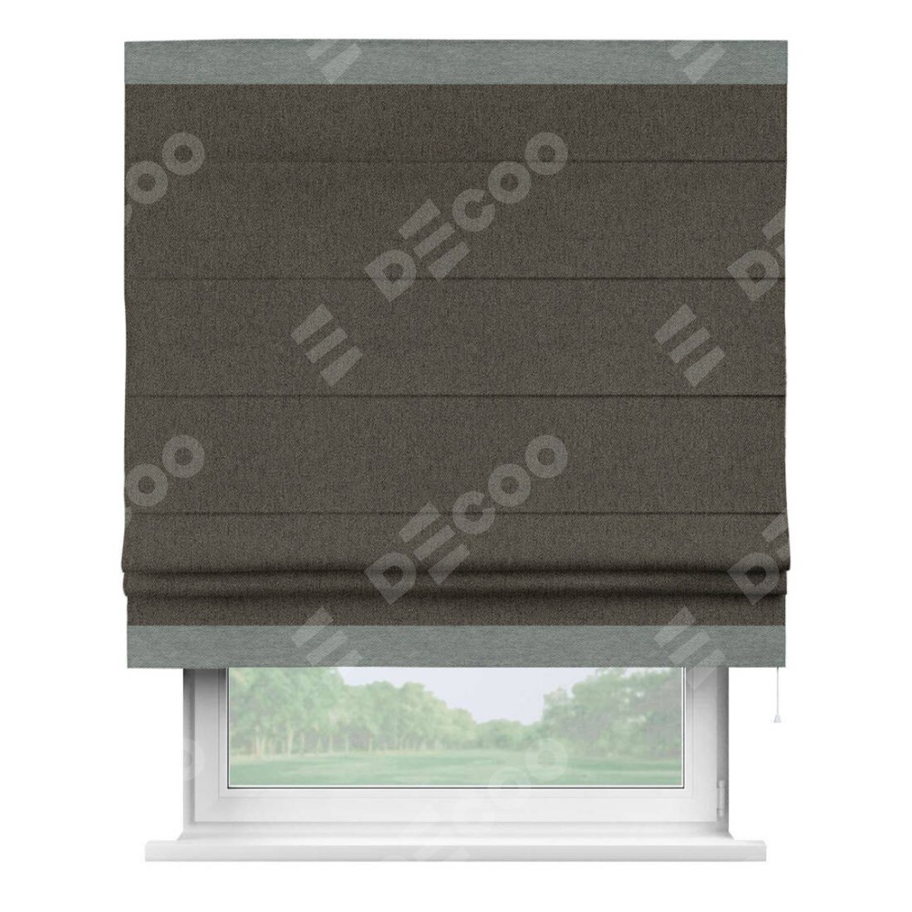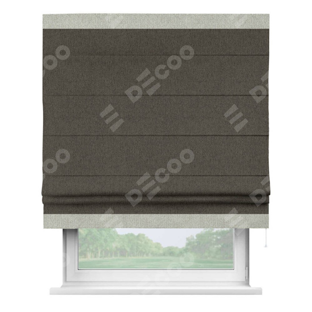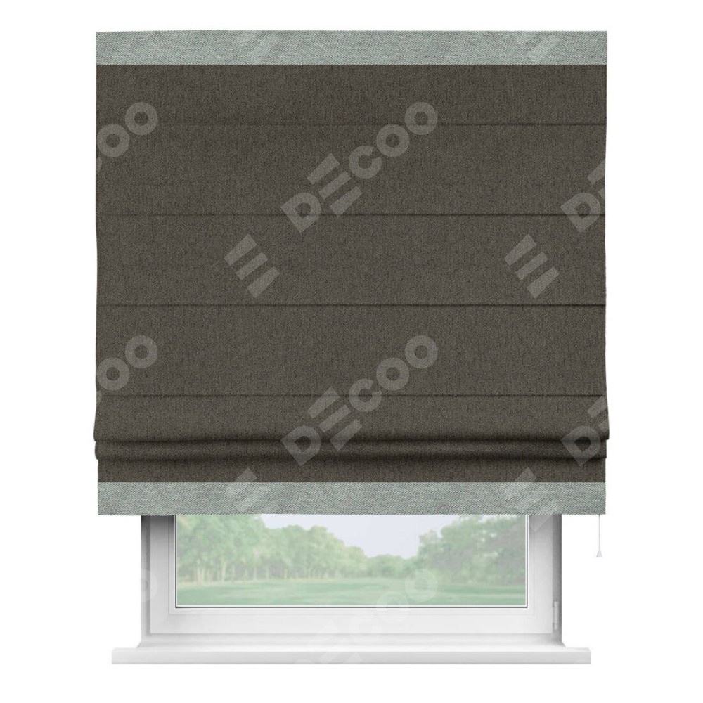Римская штора производителя «Cortin», используется для проёма, пошита из ткани твид блэкаут тёмно-коричневый, артикул 21584. Отделка шторы кантом «Горизонт», ткань для канта используется из твида разной расцветки на выбор. Имеет универсальный механизм и подходит для монтажа: на потолок, на стену и в нишу.
