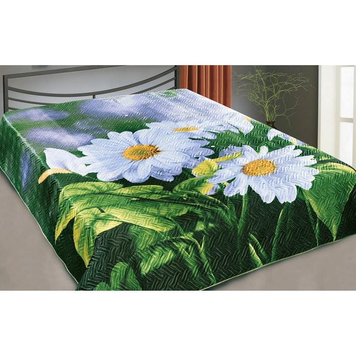 Характеристики: Ткань искусственный шелк, плотность 107 гр/м2, активное (стойкое) крашение. Верх покрывала — набивной рисунок в виде панно, низ — однотонная ткань. Края обработаны шелковой бейкой, упаковка прозрачный чемодан ПВХ с большим вкладышем.